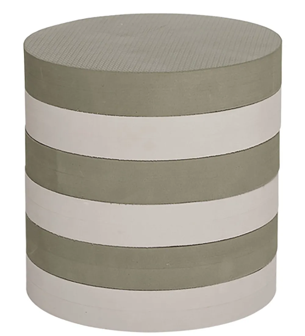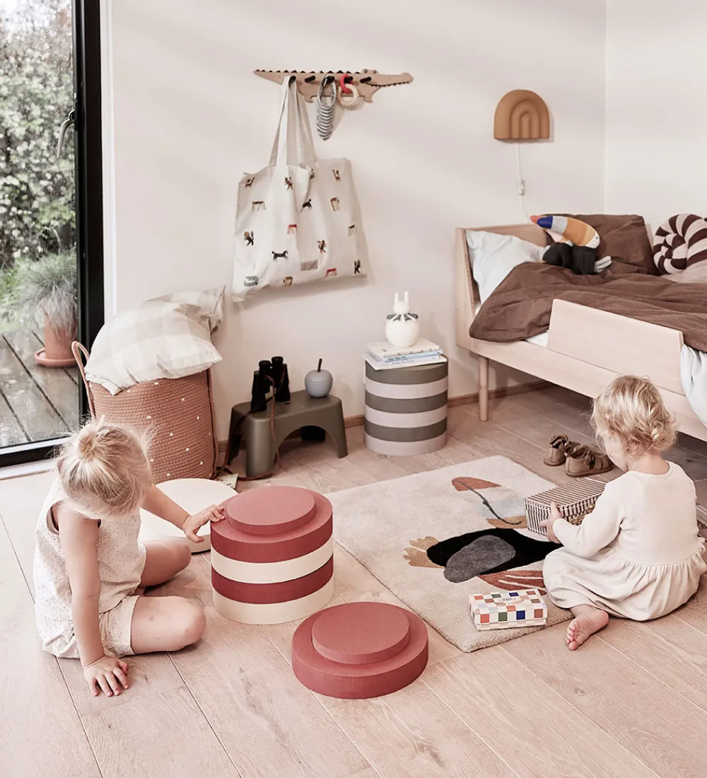 OYOY skamlen er stabelbar, da hver “stribe” udgør ét separat element, og den lavet i et blødt og robust materiale, hvorfor den er velegnet som både skammel men også legemøbel.