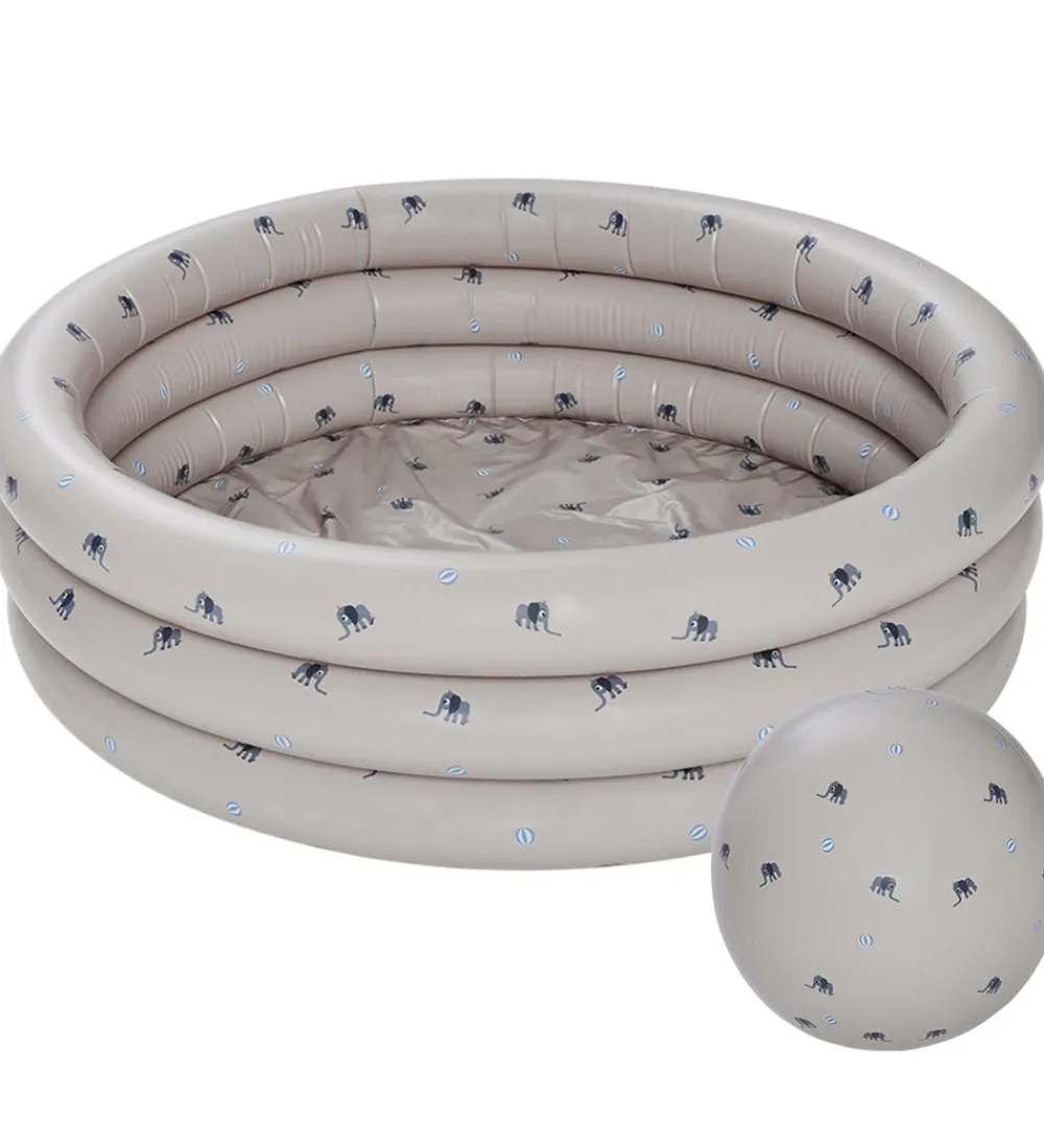 Fint OYOY badebassin og badebold i en grålig beige nuance med et alloverprint af elefanter i grå og badebolde i hvid og blå.