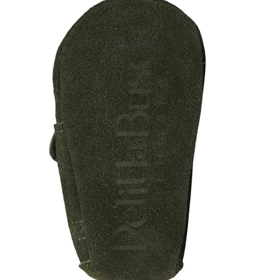 Skønne Petit La Busch skindfutter i mørkegrøn ruskind med fine syningsdetaljer.