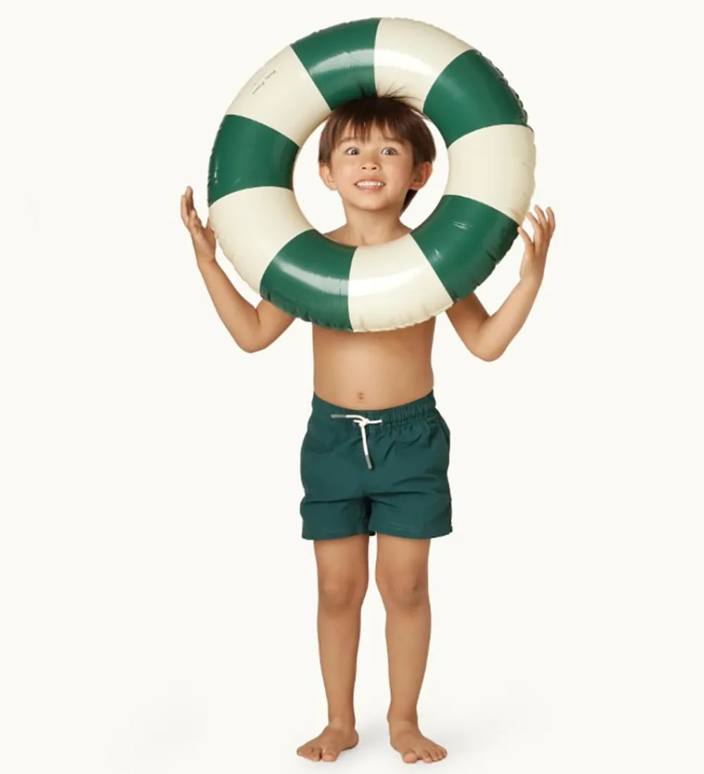 Skøn Petites Pommes badering i et stribet design med cremehvide og mørkegrønne farver.