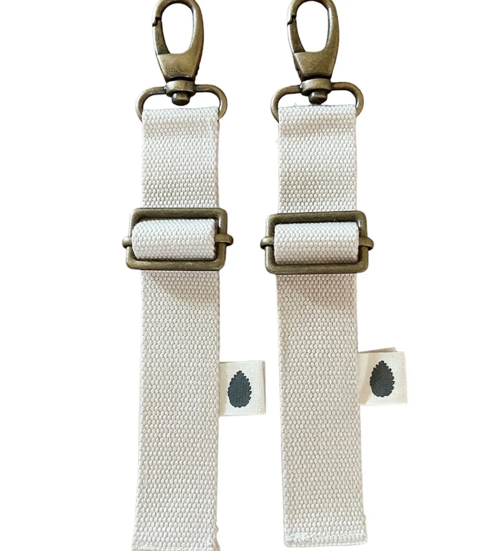 Pine Cone klapvognstropperne passer til pusletasken fra Pine Cone, så den nemt kan hægtes på styret på en barnevogn eller en klapvogn. Stropperne sættes på pusletasken med karabinhager, og de lukkes sammen om styret med velcro. Stropperne kan justeres i længden, så pusletasken passer til klapvognen.