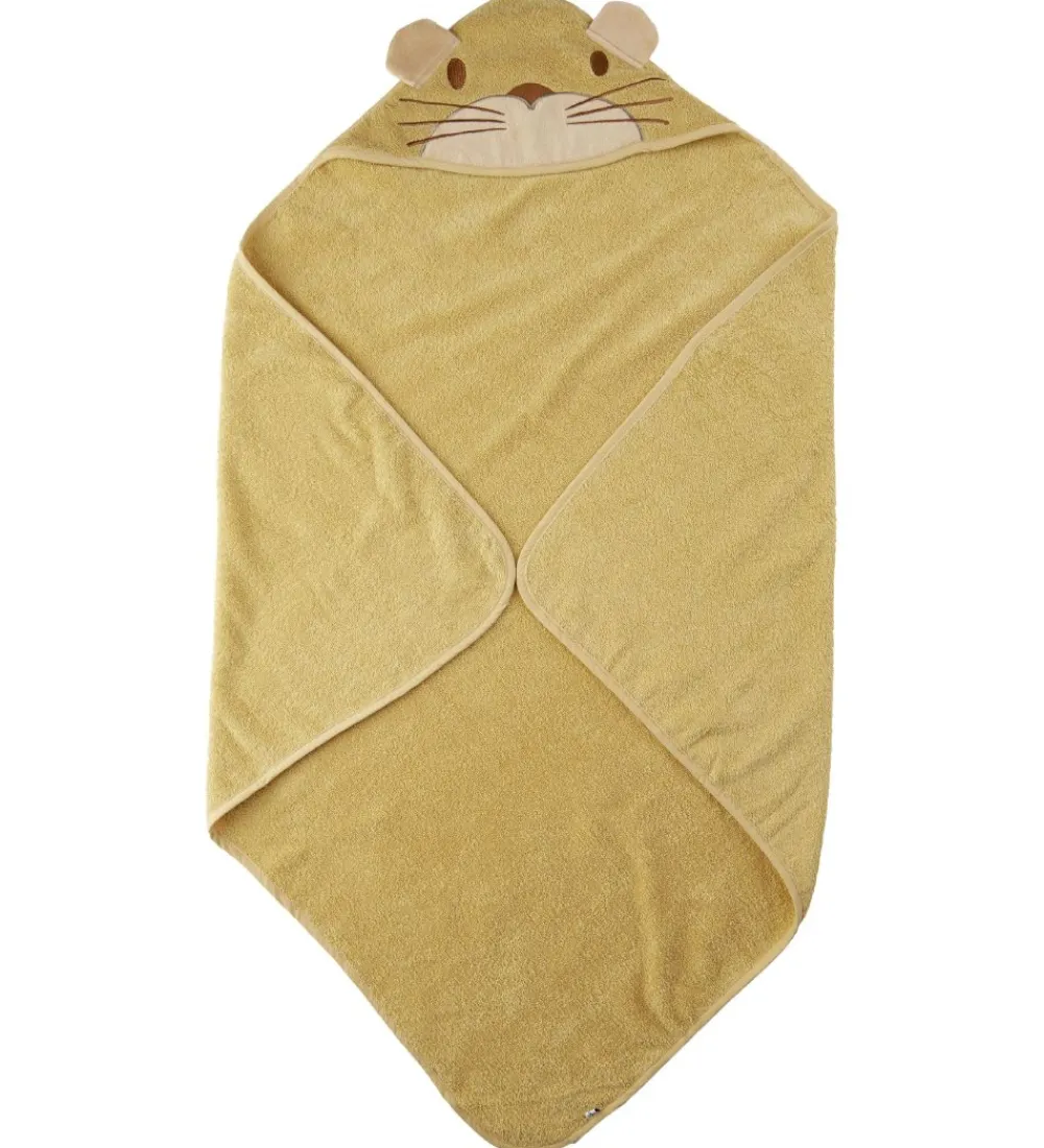 Fint Pippi babyhåndklæde i gult frotté med en hætte, som har et sødt, broderet katteansigt.