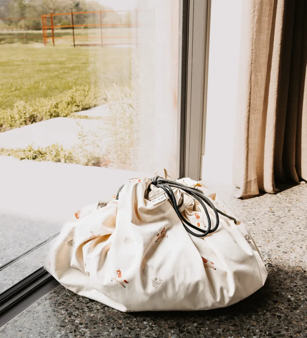 Charmerende Play&Go legetæppe og opbevaringspose med to-i-en funktion. Legetæppet er råhvidt med støvet grøn kant og dobbetsidet print med eventyrligt tema. Legetæppet har en rund facon med snore i siderne, som kan trækkes sammen, så legetæppet bliver til en opbevaringspose.