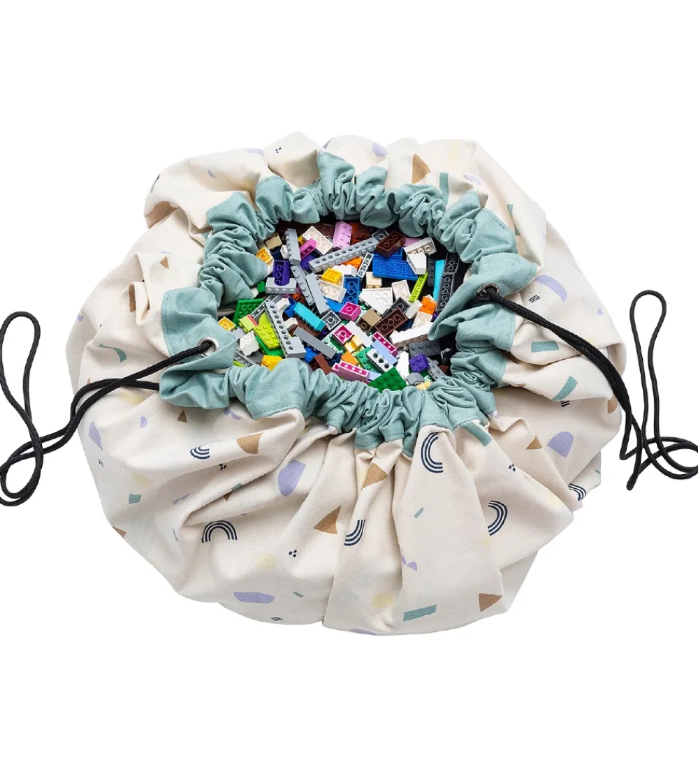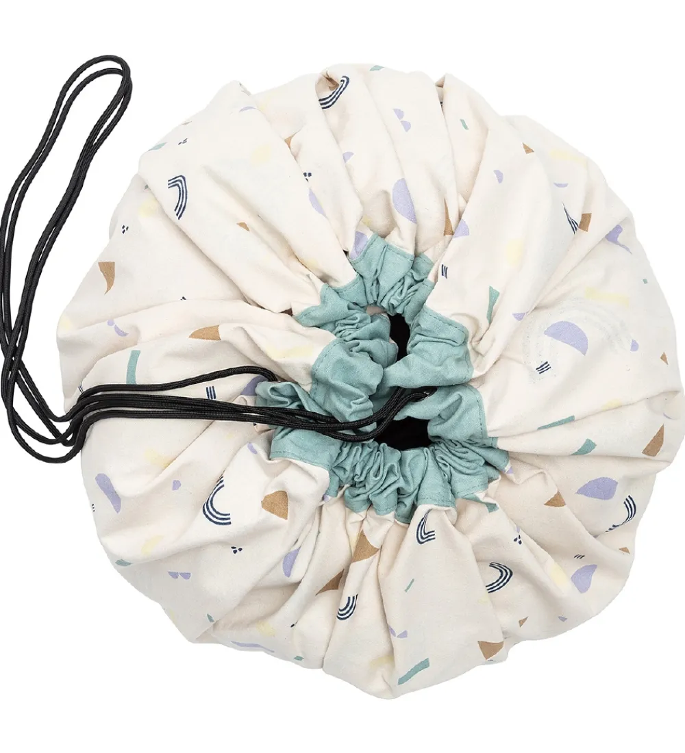Play&Go legetøjstæppet er et stort cirkelformet stykke stof med en løbegang hele vejen rundt med en sort snor, så man kan snøre tæppet sammen til en pose. I posen kan man opbevare sit legetøj, og når børnene synes, at legetøjet skal med ind i stuen, kan posen åbnes og legetæppet folder sig ud. Bagefter er det hurtigt og nemt at rydde op og lægge på plads.