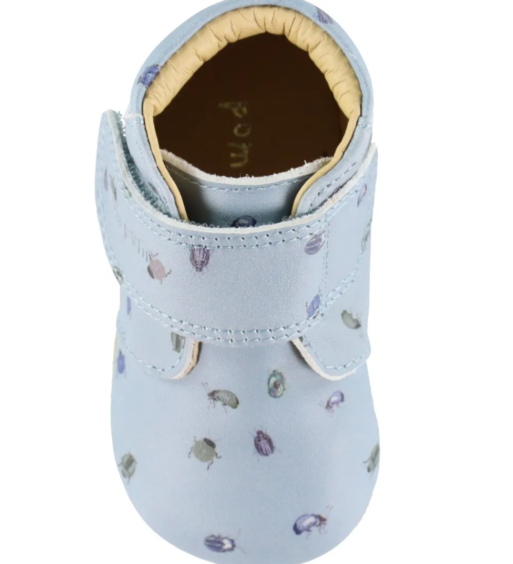 Fine Pom Pom skindfutter i lyseblåt skind med et sødt af små, farverige biller.
