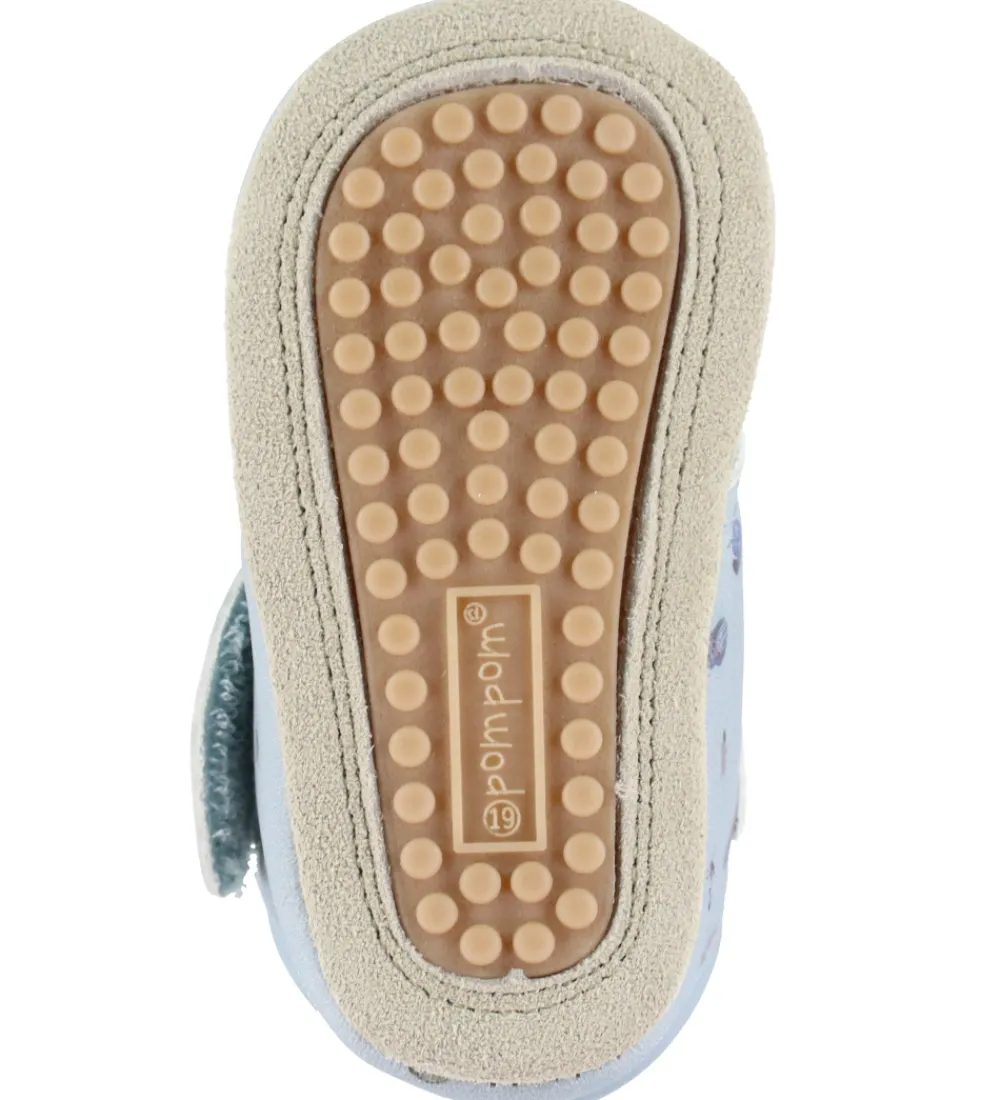Pom Pom skindfutterne er lavet i blødt læder, der giver en fleksibel sko, som ikke klemmer, og åbnes over vristen med en bred velcrorem. Indvendigt er de forede med læder og har bløde, udtagelige skindsåler med en god svangstøtte.