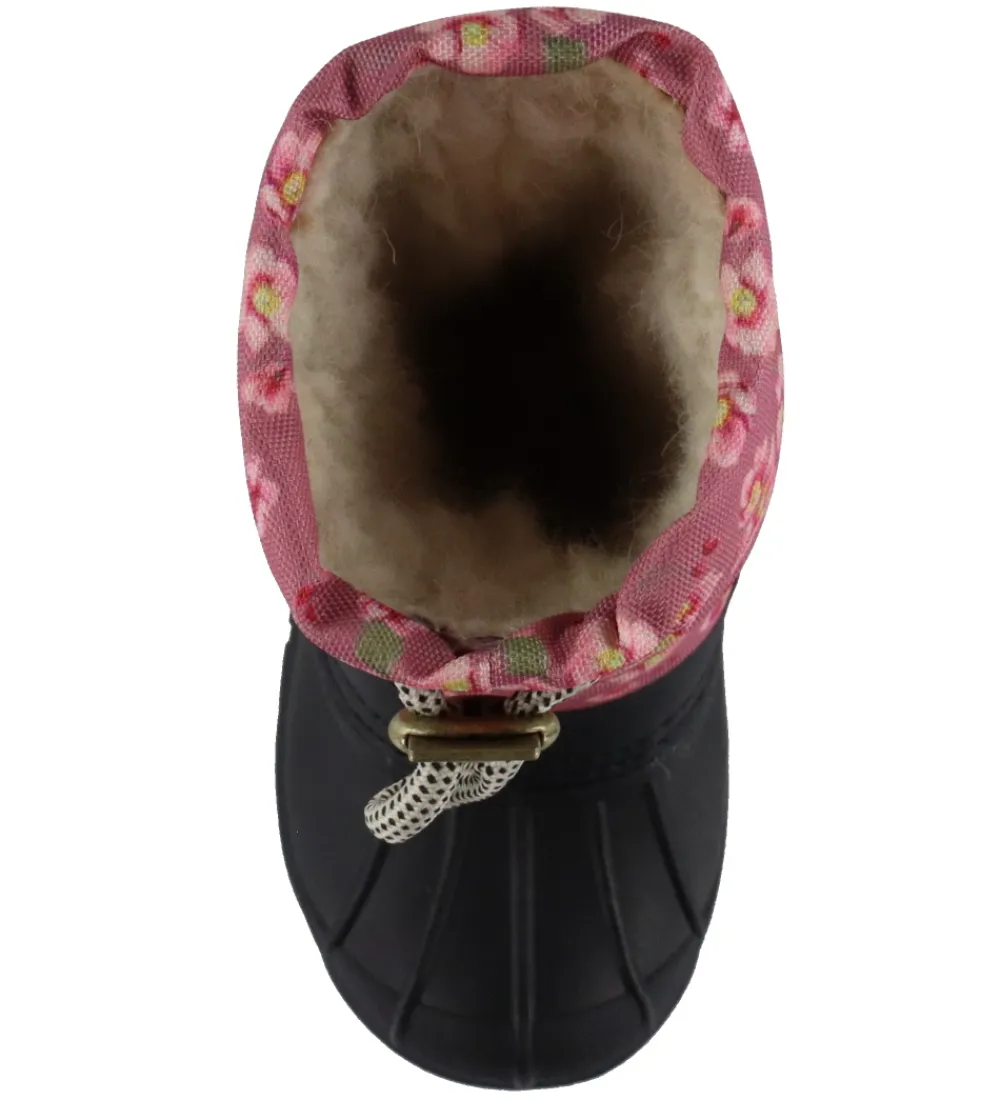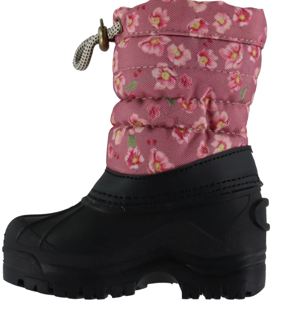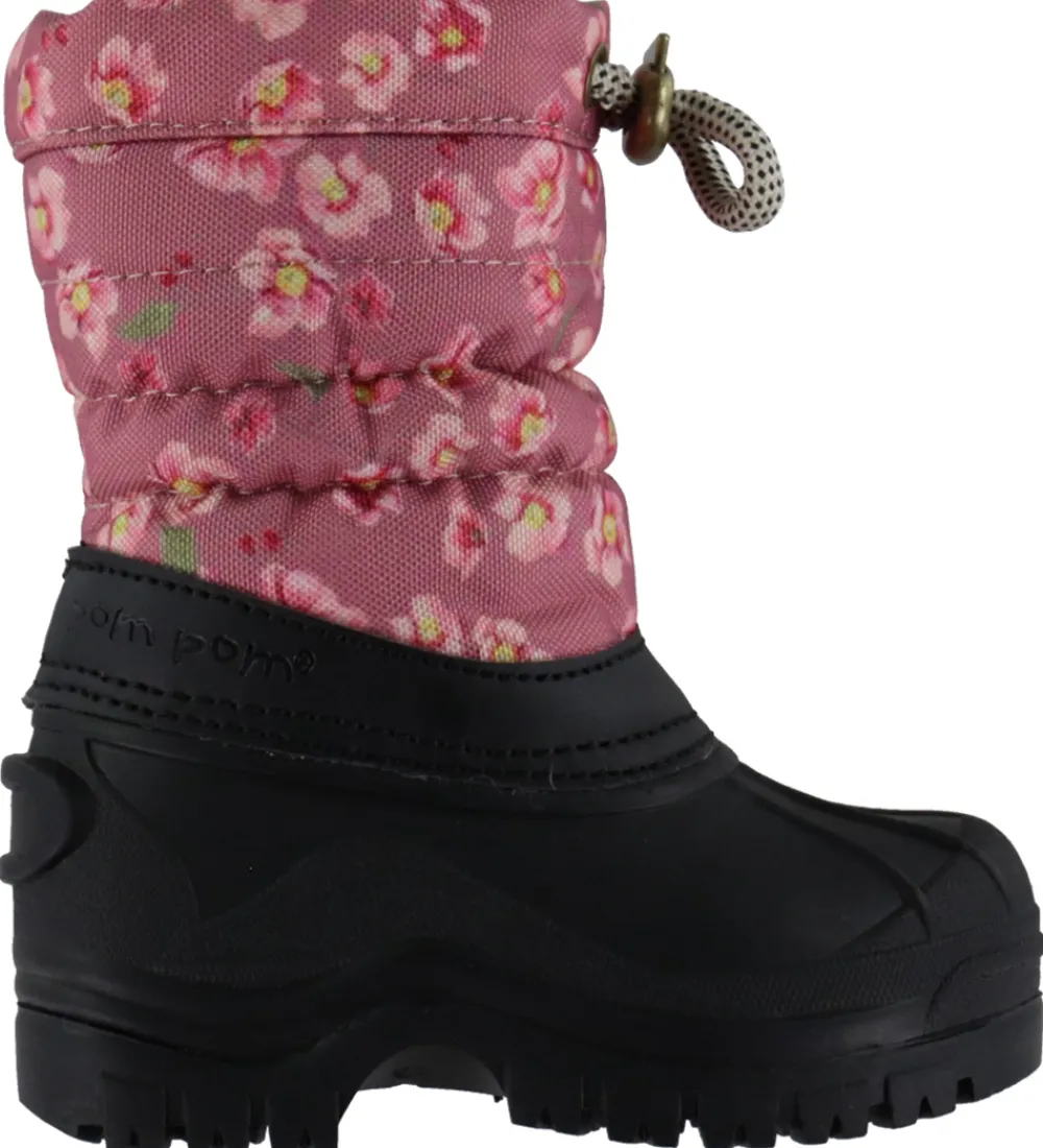 Fine Pom Pom vinterstøvler med et rosafarvet skaft med blomster og en sort ydersål.