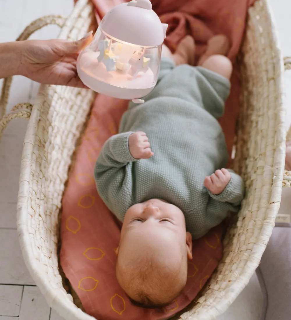 Rabbit & Friends lampen giver et godt lys og har 7 forskellige farver samt normalt lys. Den kan enten lyse med et normalt lys, eller et lys i skiftende farver. I bunden er der en lille knop, som skal drejes for at få hestene til at køre rundt og spille sødt musik.