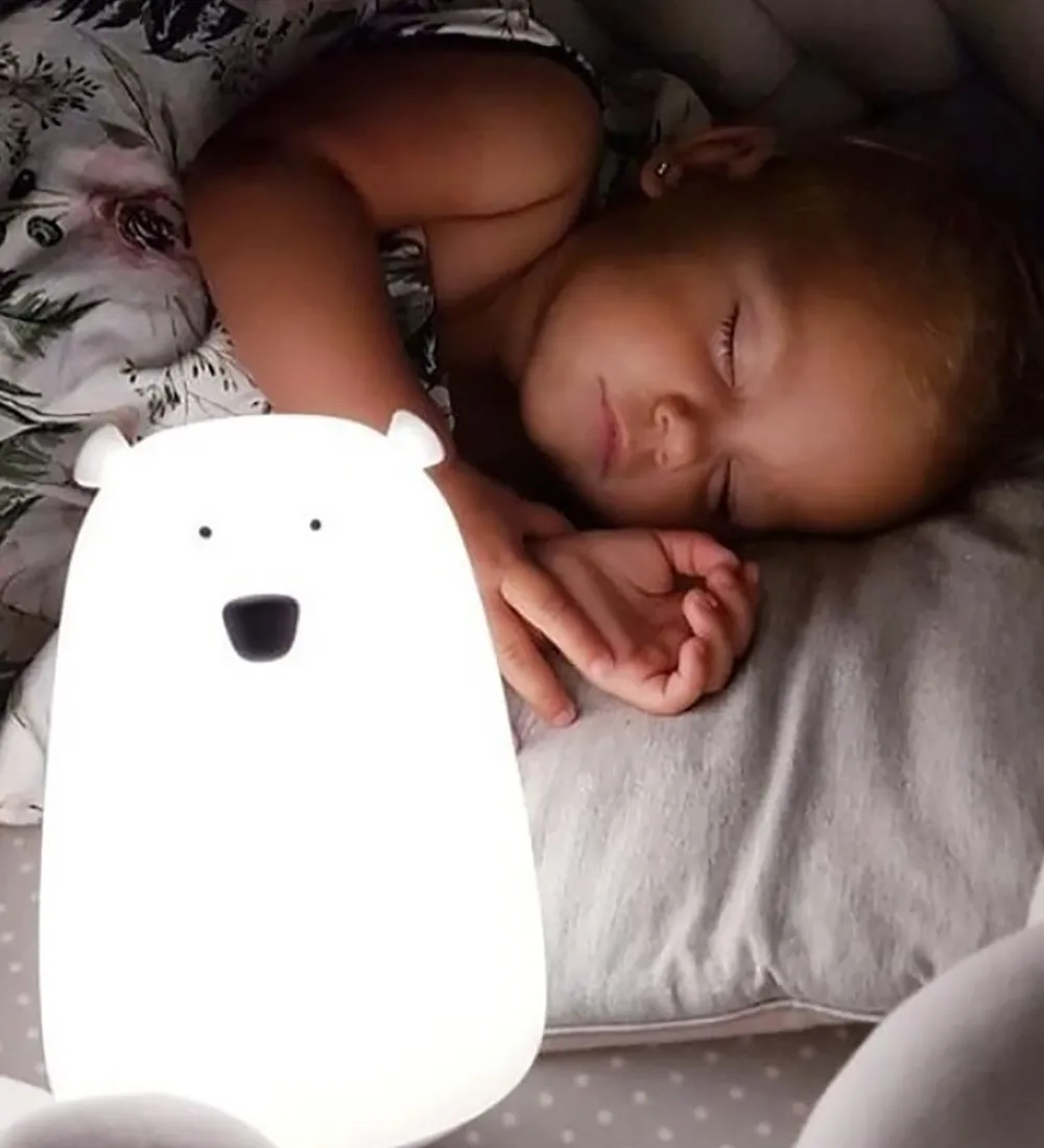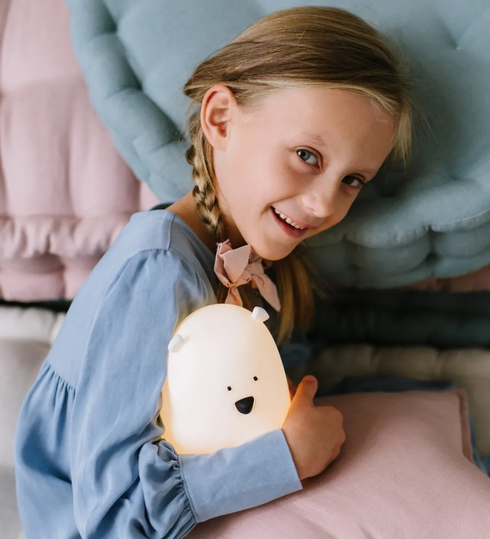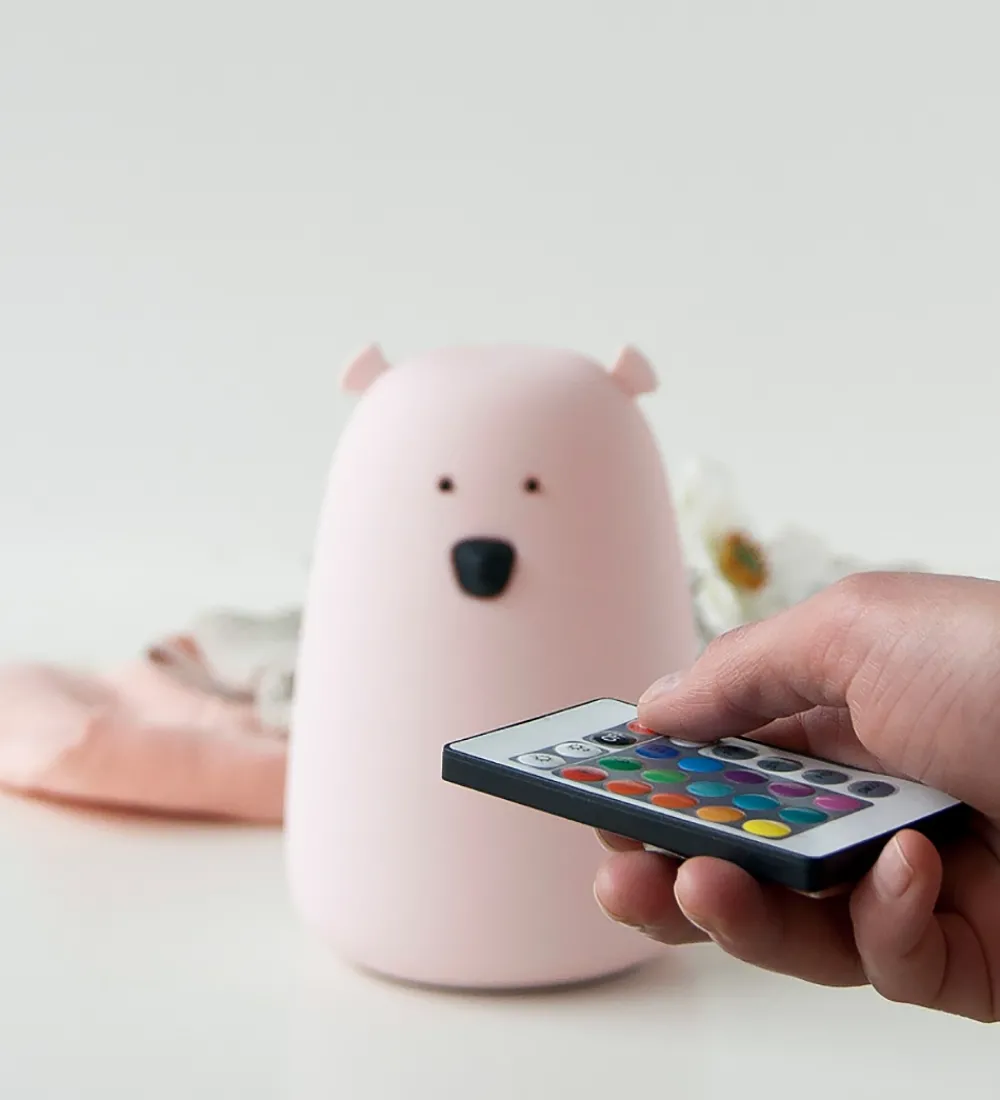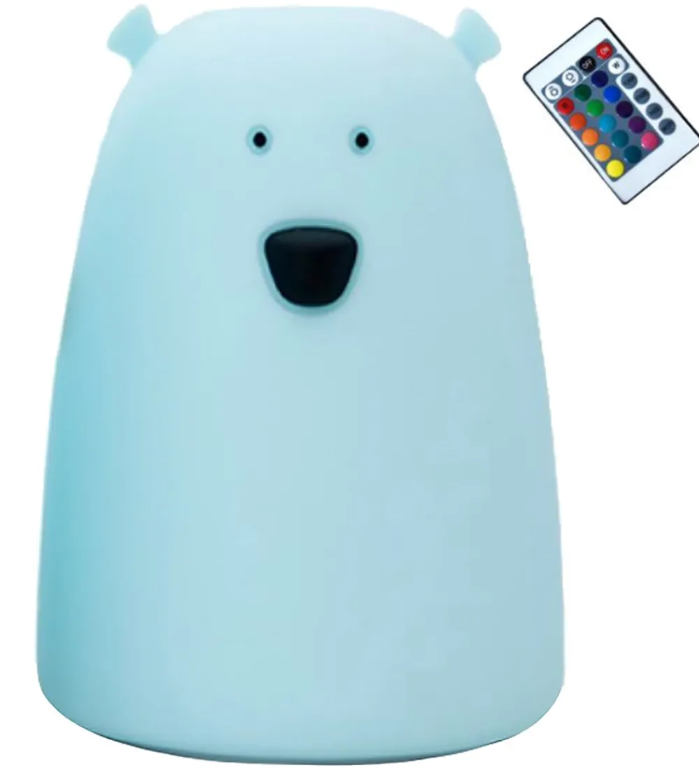 Smart Rabbit & Friends lampe i blå med form som en bjørn, med søde ører og ansigt samt medfølgende fjernbetjening og opladerkabel.