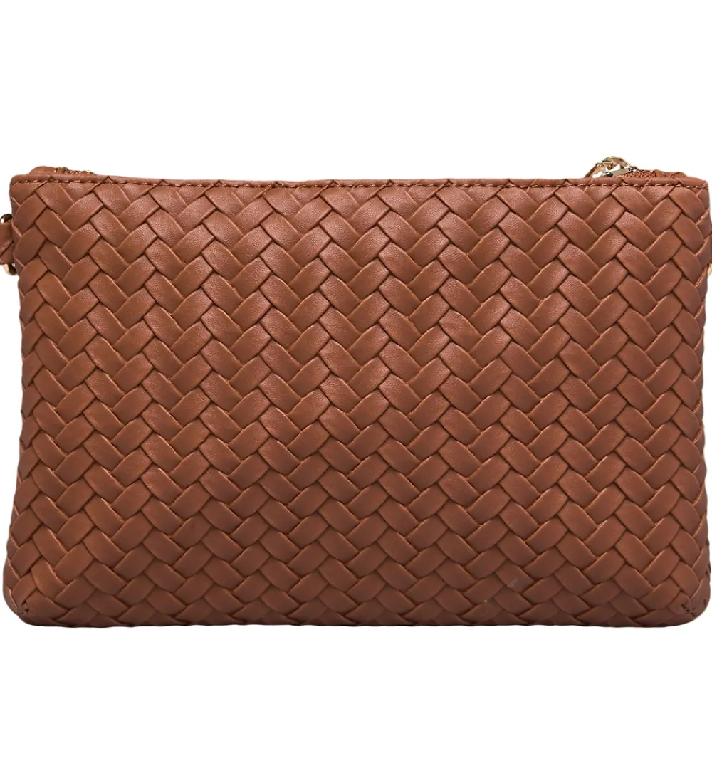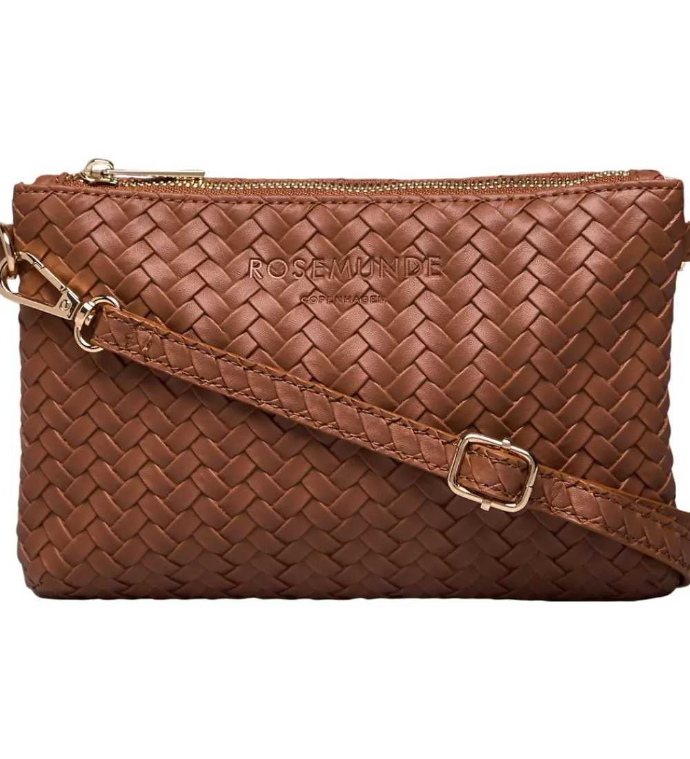 Elegant Rosemunde clutch i imiteret, brunt læder med et fint fletmønster.