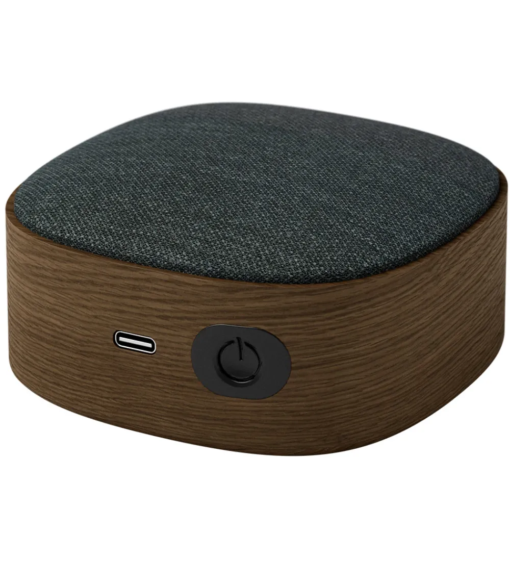 Transportabel SACKit GO WOOD højtaler i mørk egetræ, med en tekstilfront i grå. Højtalernes front kan udskiftes til andre Go fronter og fås i mange forskellige farver.