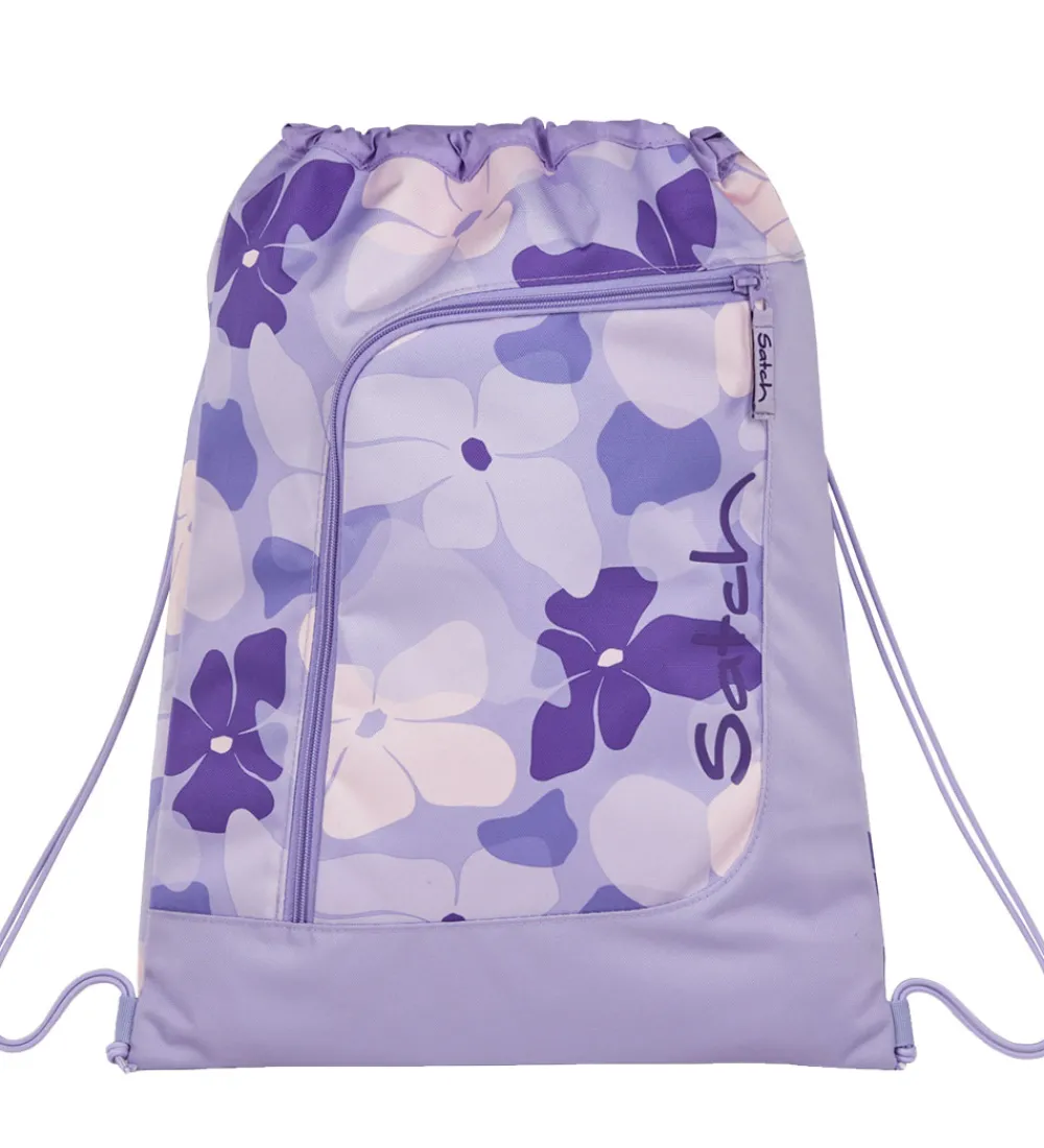 Smart Satch gymnastikpose med blomsterprint i lilla nuancer, og ned ad den ene side er der printet “Satch”.