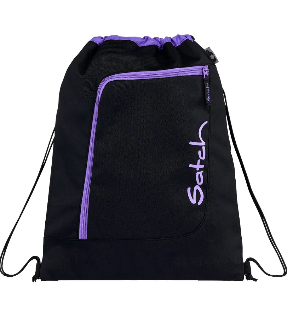 Skøn Satch gymnastikpose i sort med lilla detaljer og logo.