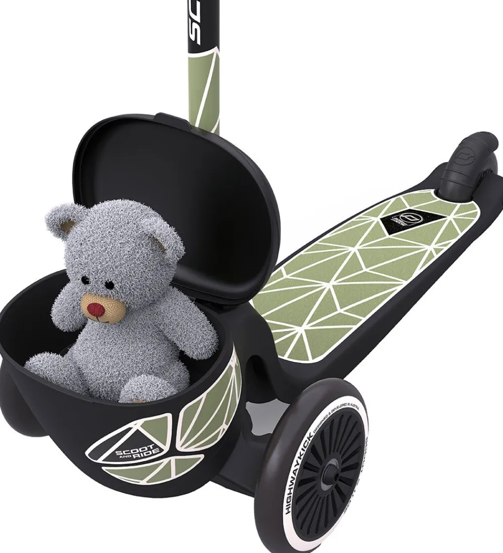 Scoot and Ride Highway Kick 2 er et smart løbehjul med to store hjul foran og et lille hjul bagpå med gode bremser. Løbehjulet har en bred plade til at stå på, med et skridsikkert materiale og er dermed meget stabilt. Fortil er der en praktisk opbevaringsboks, til f.eks. yndlingsbamsen eller lignende. Hele styret kan tags af, så det er let at opbevare. Hjulene er i hård gummi.