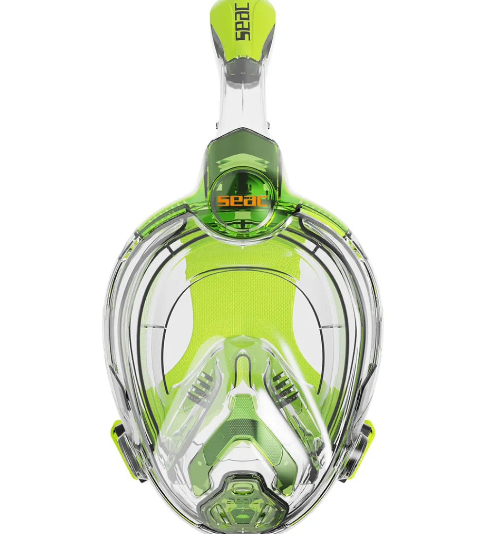 Seac snorkelmasken har en anti-dug panoramaskærm i polykarbonat, der dækker hele ansigtet, samt et allergivenligt silikoneskørt og spændes fast og justeres med stropper i allergivenligt silikone. Stropperne går langs siderne og bag om hovedet, hvor spænderne sidder i siderne. Spænderne har begge en smart funktion, der gør det muligt med et hurtigt tryk at få masken af med én hånd.