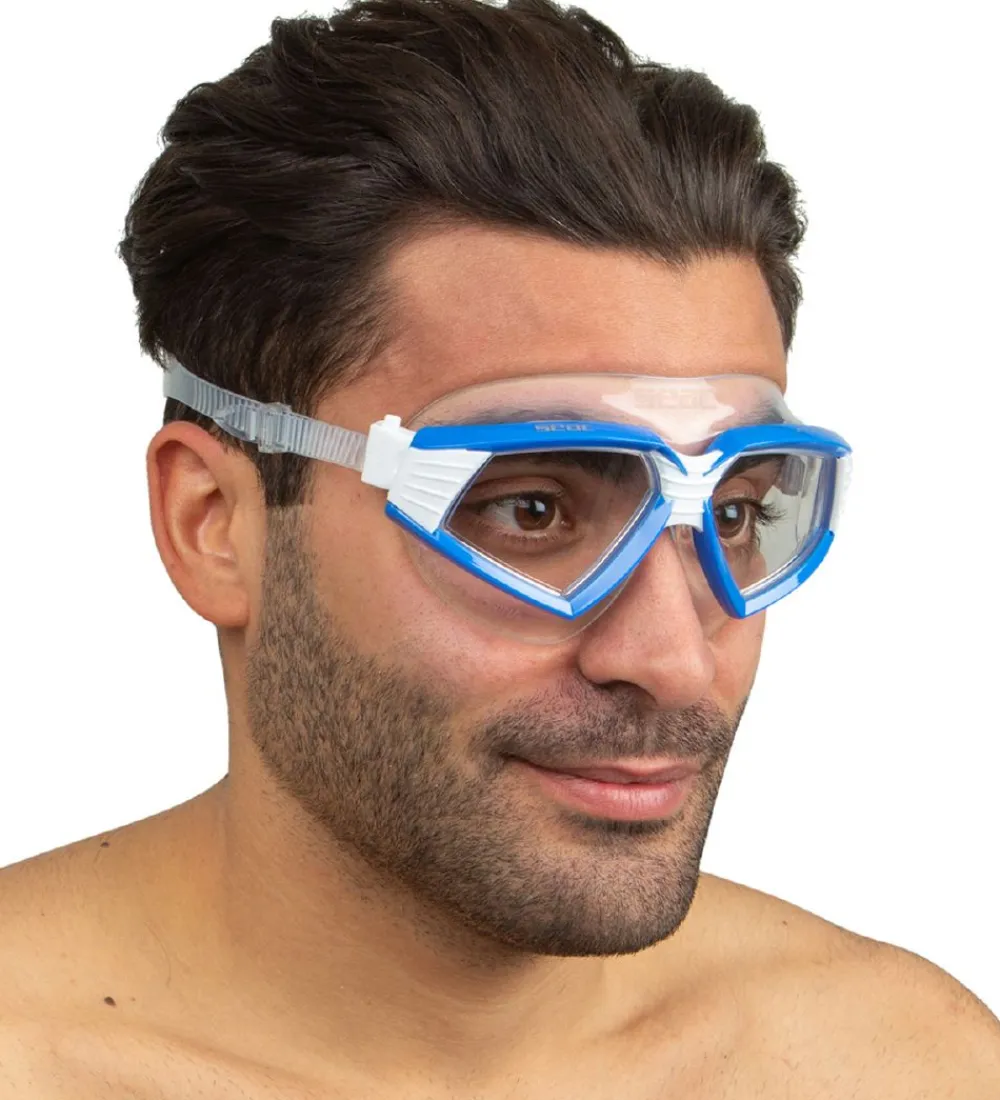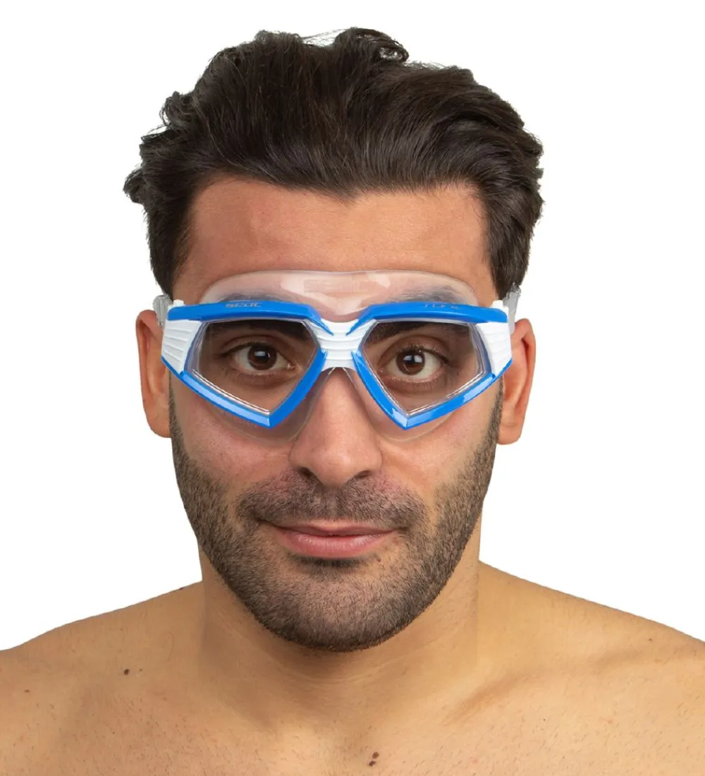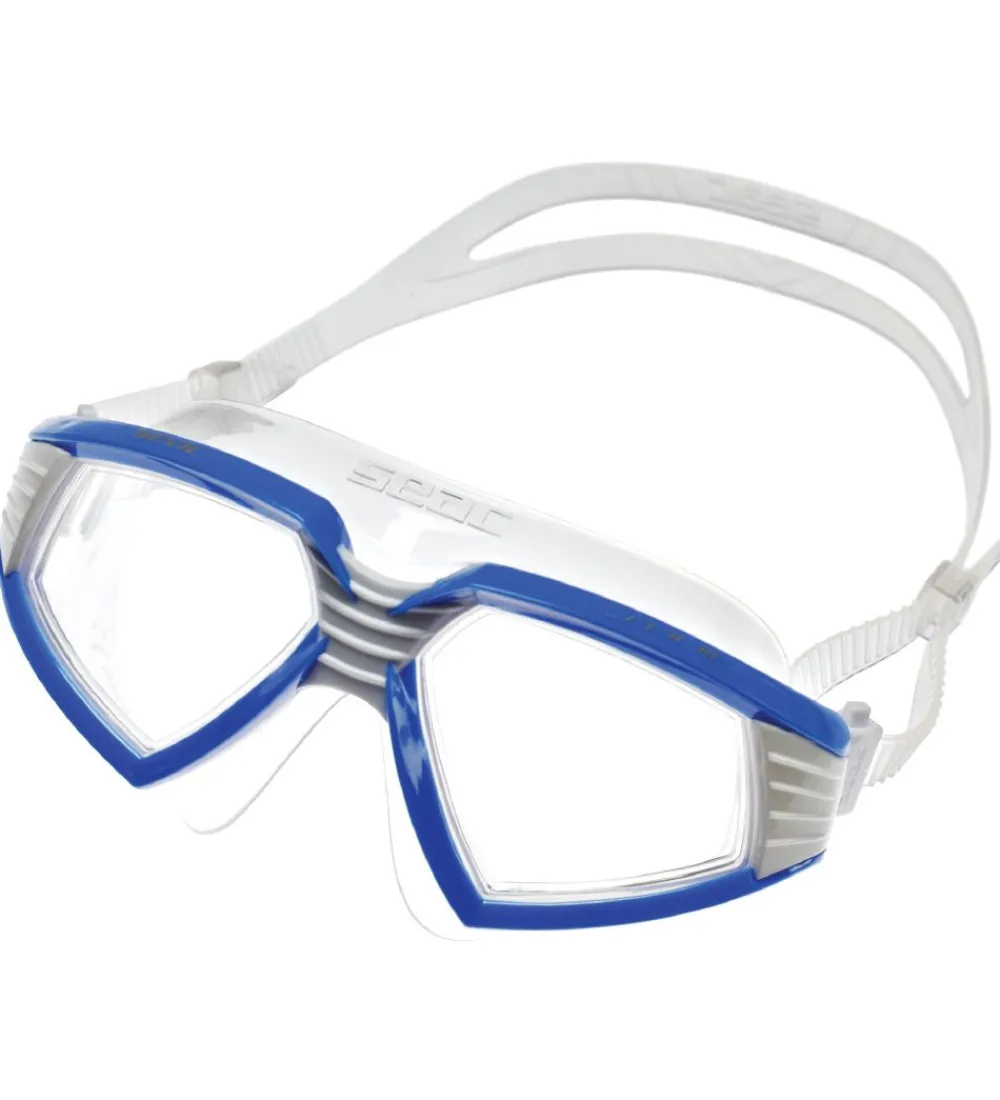Lækre Seac dykkerbriller i blå og hvid i en voksenmodel.