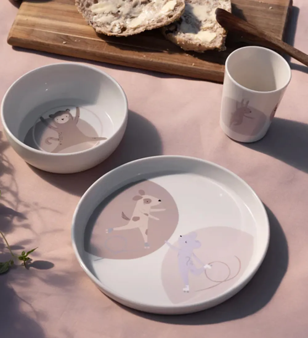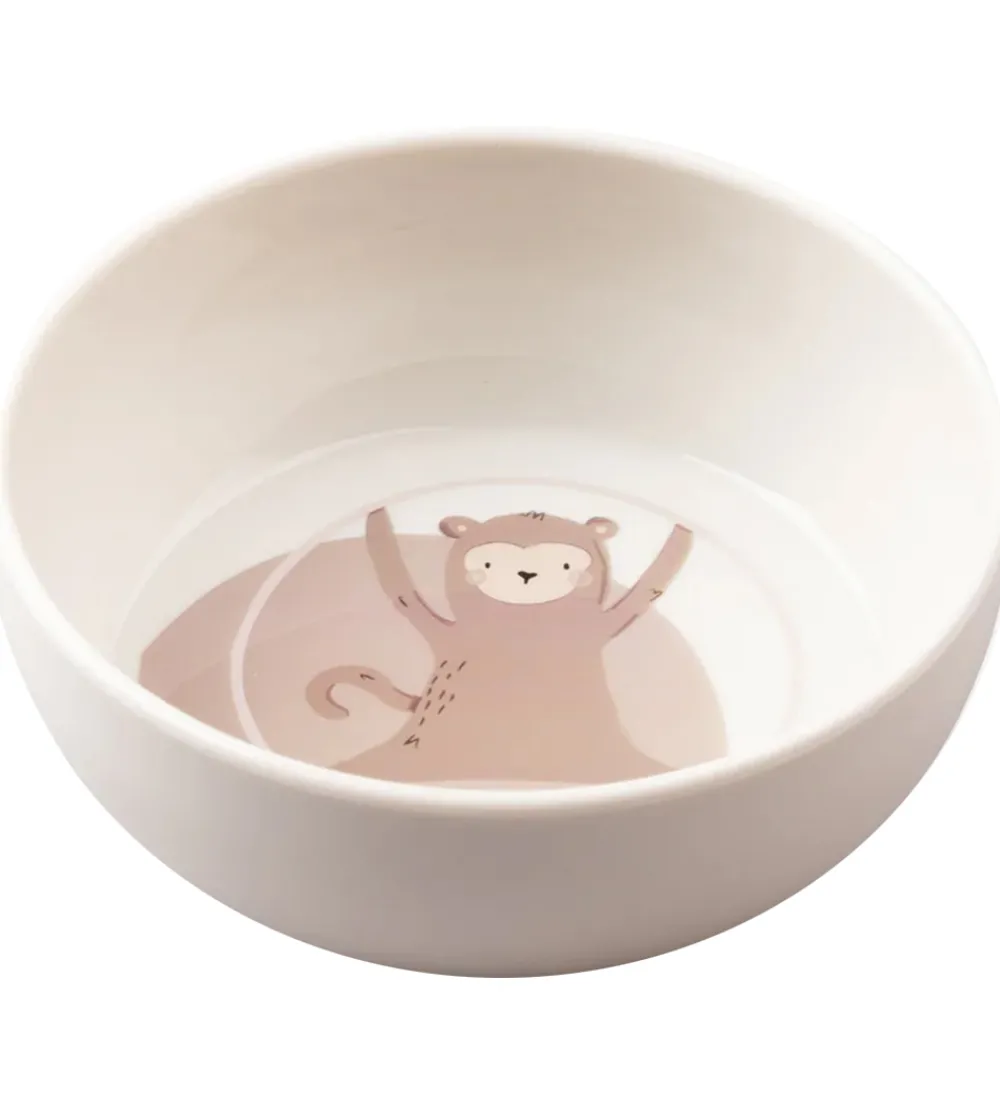 Fin Sebra skål i hvid med print af søde dyr, som danser, hopper og leger og i afdæmpede, forskellige farver.
