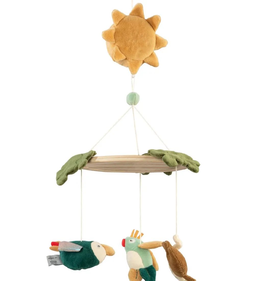 Sebra musikuroen har et stort spejl i bunden af cirklen, så de små kan se dem selv for en sjov detalje. Musikuroen hænges op med solen i toppen, som har en lille krog som let kan hænges fast. Musikken startes ved at dreje på en knap bagpå solen, hvor den spiller en beroligende melodi af Johannes Brahms.