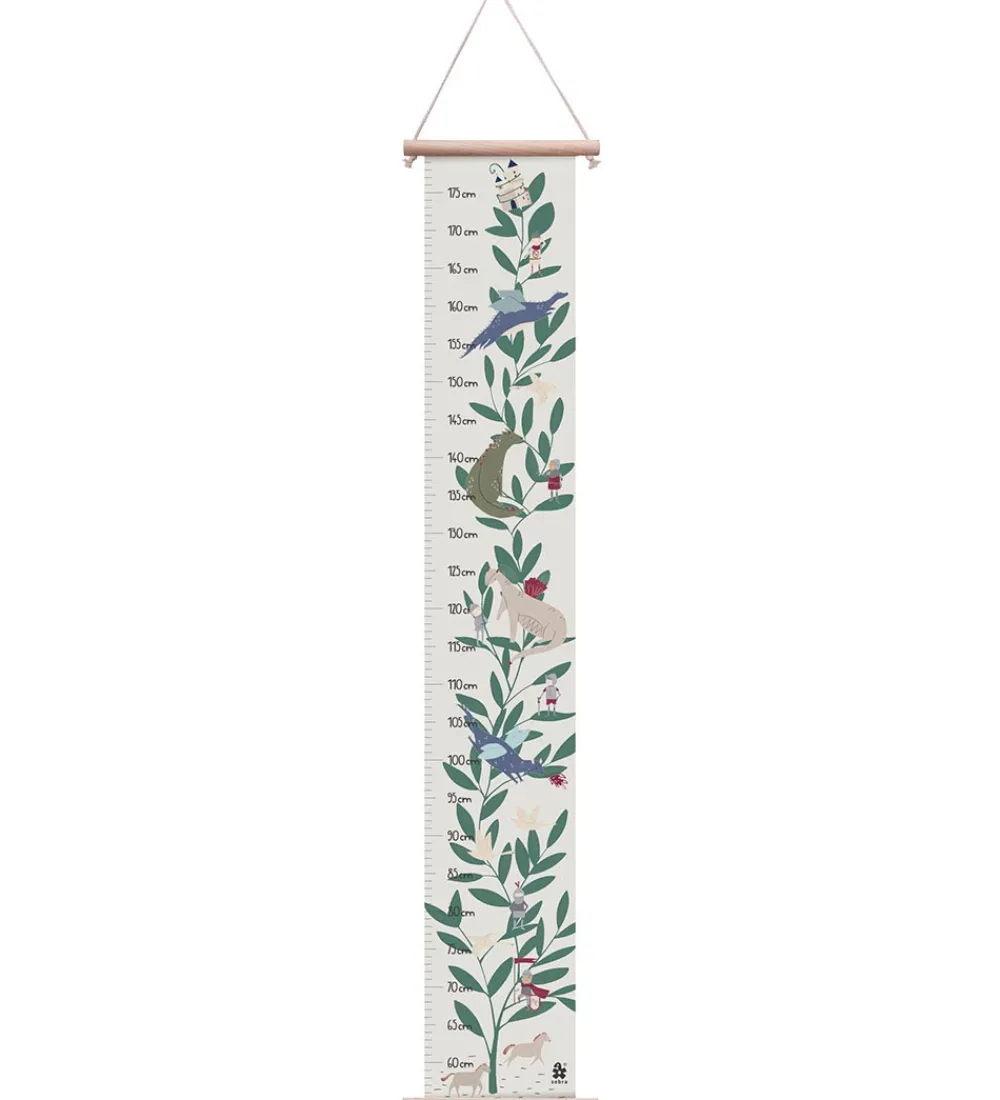 Sebra vægdekorationen er lavet som en højdemåler med centimetermål fra 56-179 cm. Vægdekorationen består af papir, som er monteret mellem to træholdere, og den hænges nemt op med et søm. Barnets højde kan markeres med en tusch eller med små klistermæker direkte på højdemåleren.