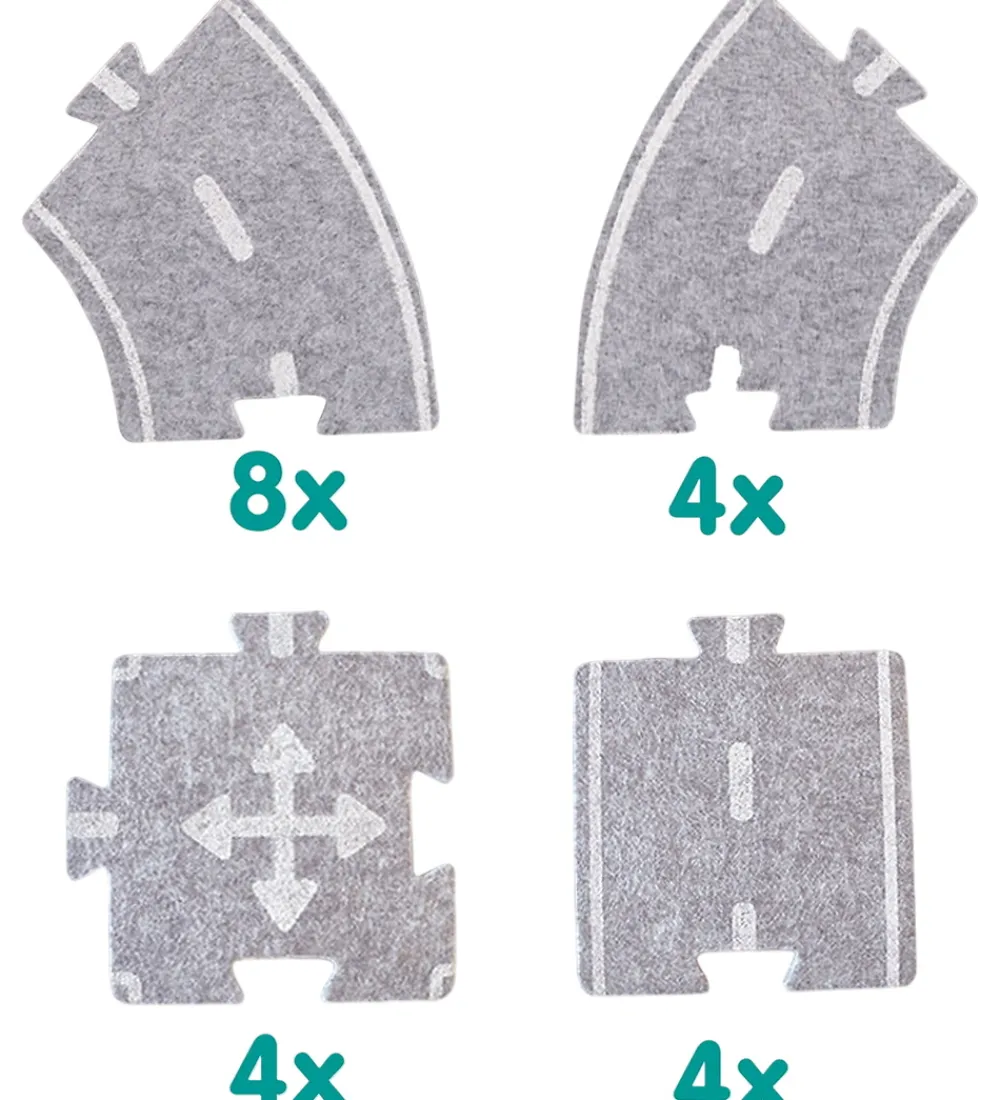 Sættet giver mulighed for kreativ leg med bløde filt vejbanestykker.