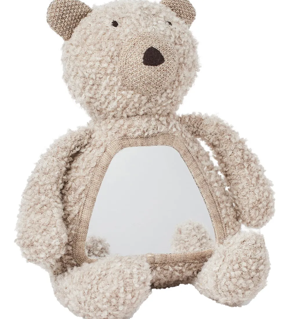 Fin Smallstuff aktivitetsbamse formet som en bjørn i beige nuancer og har en blød, strikket boucléstruktur.