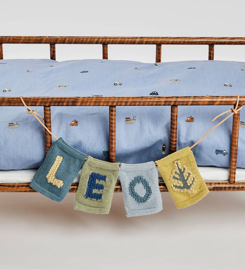 Flot Smallstuff flag i gul med en strikket struktur og et dekorativt bladmotiv i blå. Med Smallstuff flaget kan du hænge den sammen med barnets navn og danne en fin og hyggelig flagranke.