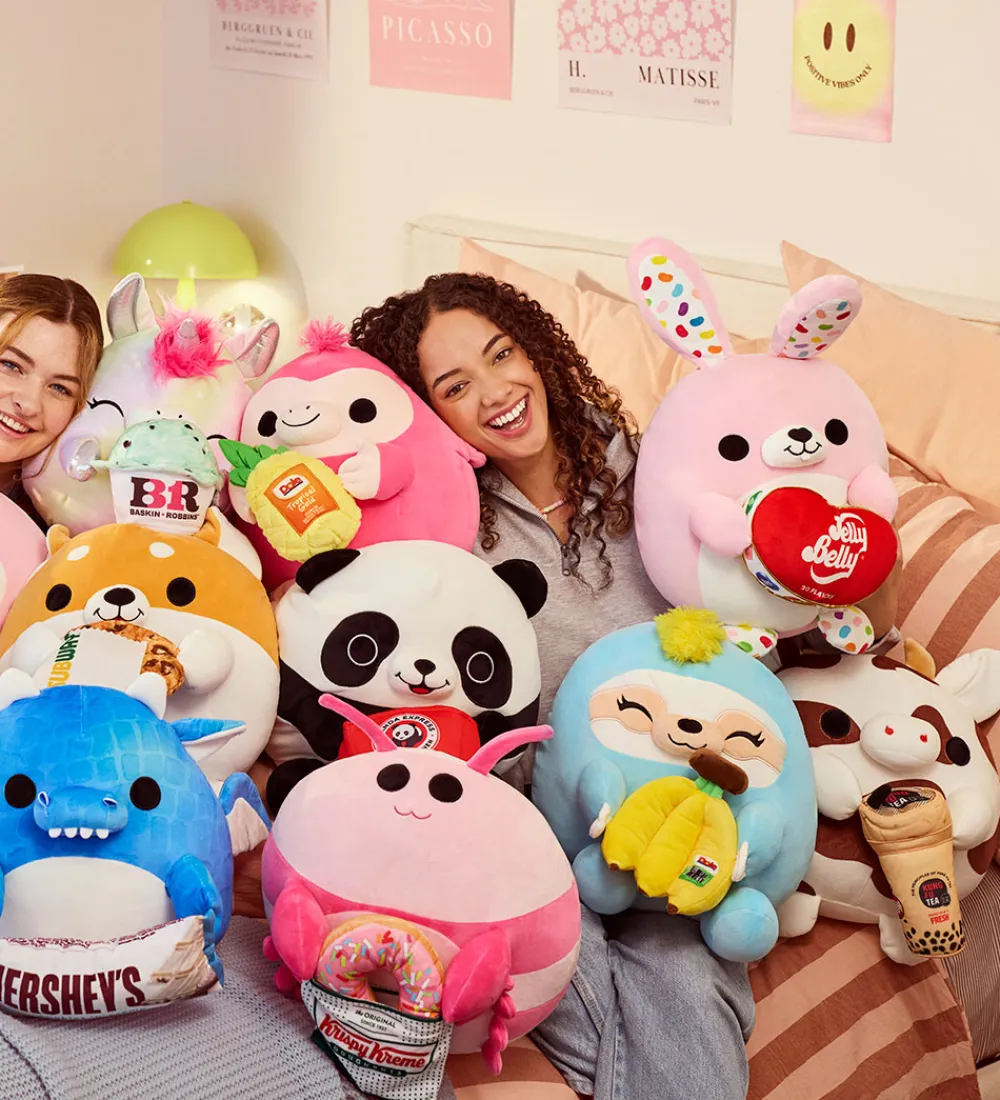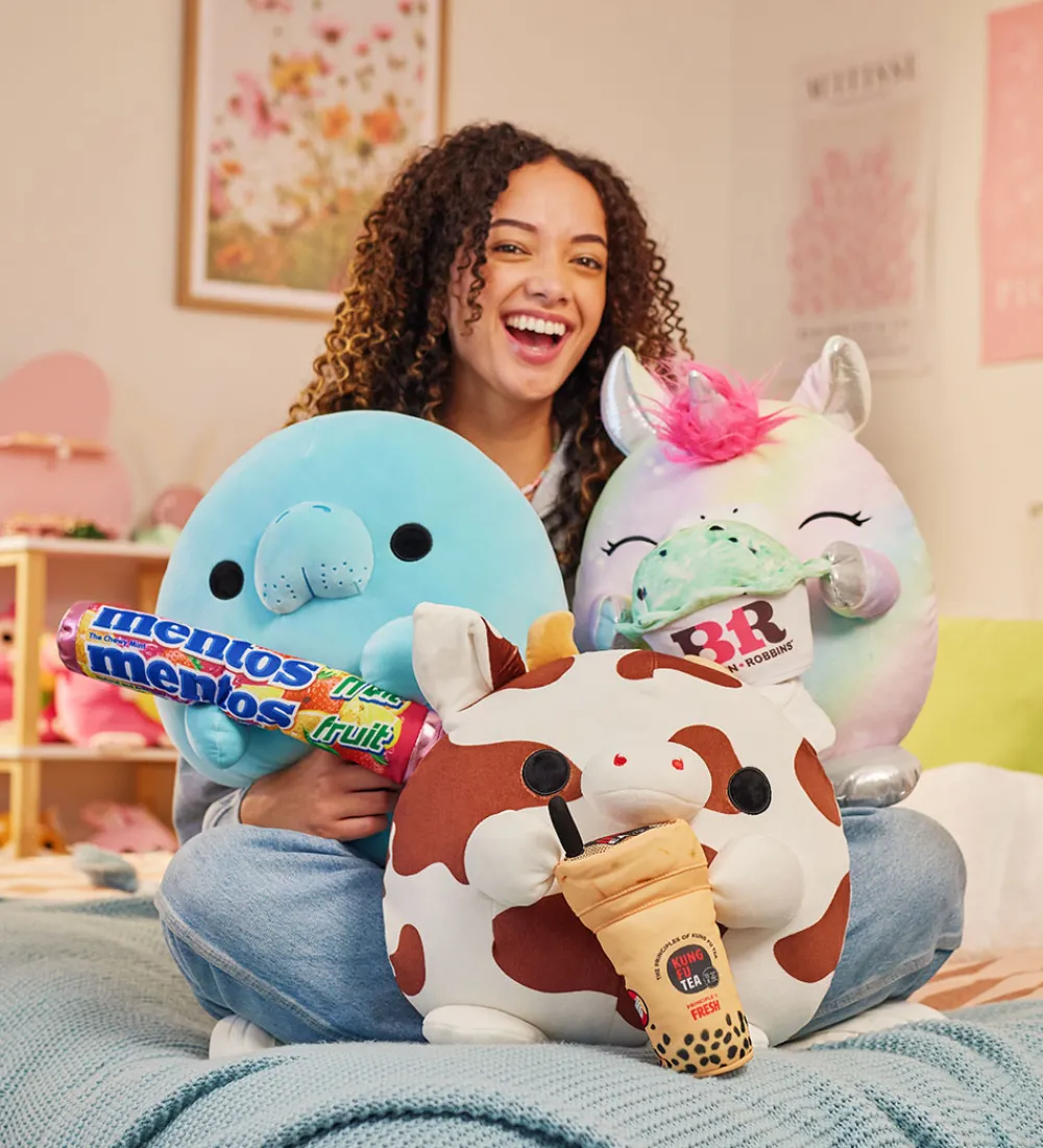 Sød Snackles bamse i form af koen Bonnie i hvid med brune pletter og en bubbletea i hænderne. Bamsen er udformet som en rund pude med ører, små horn og et sødt ansigt.