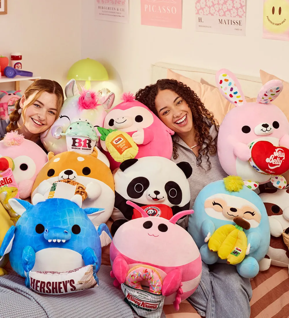 Nuttet Snackles bamse i form af kaninen Flossie i rosa pg hvid med en Jelly Belly i hænderne. Bamsen er udformet som en rund pude med lange ører og et sødt ansigt.