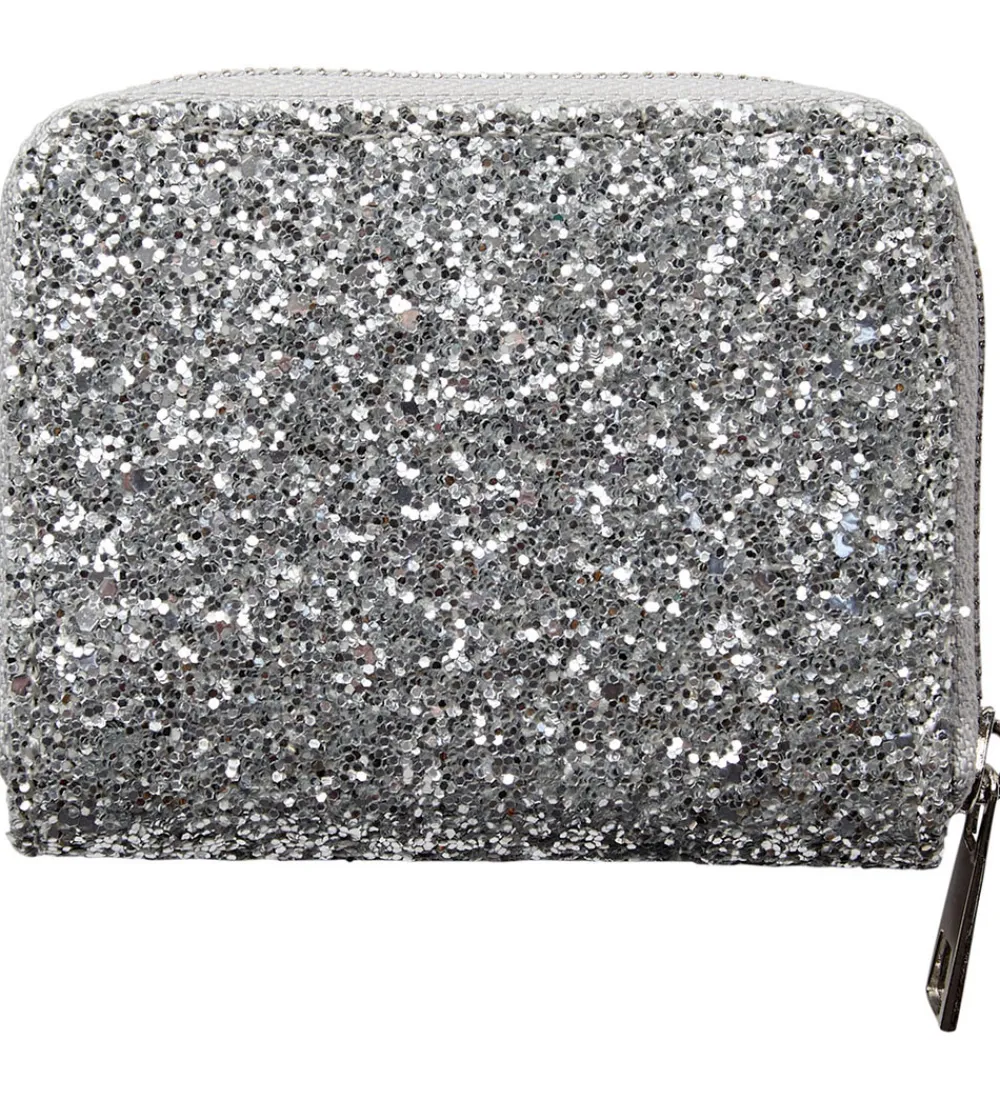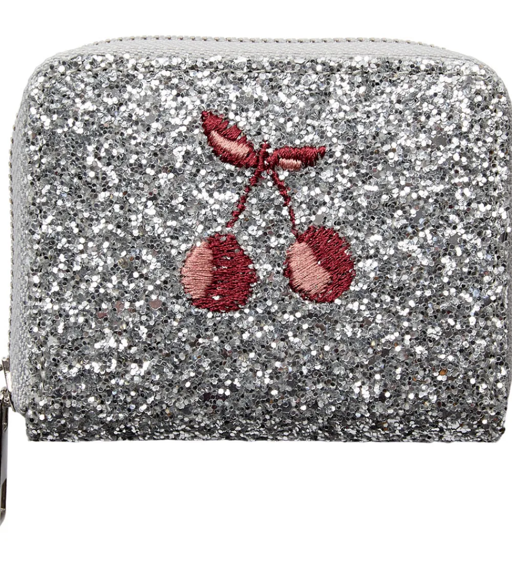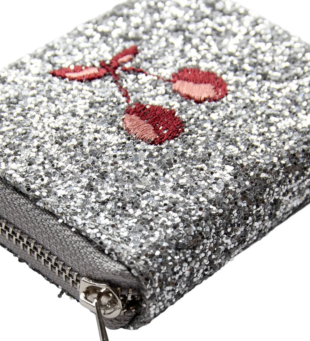 Stilfuld Sofie Schnoor pung i en skinnende sølvfarve med et broderet kirsebærmotiv på forsiden.