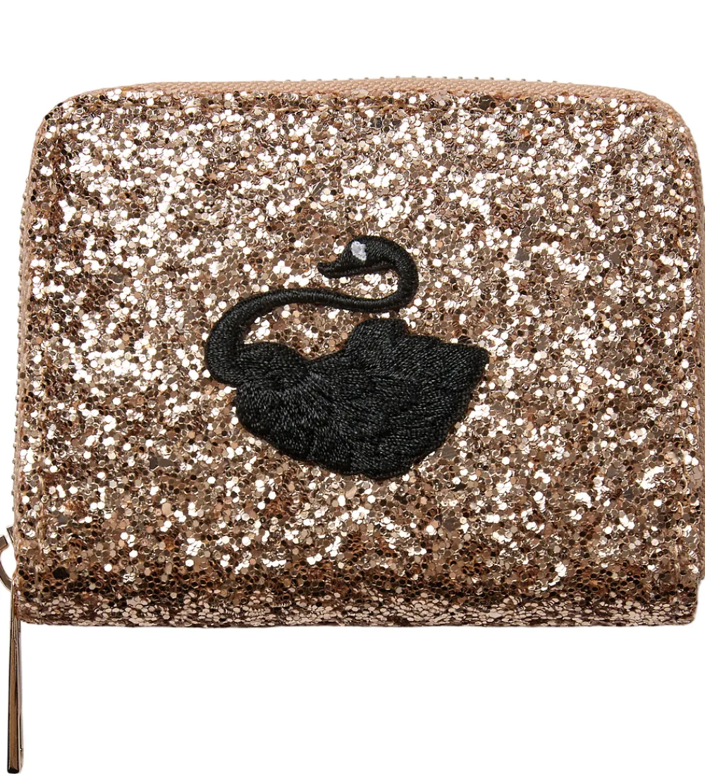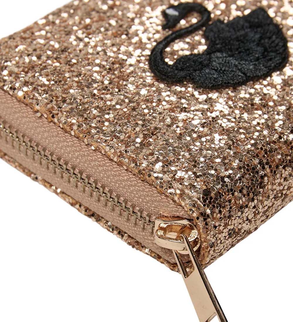Fin Sofie Schnoor pung i rosa med glimmer, og på den ene side er der broderet en sort svane.