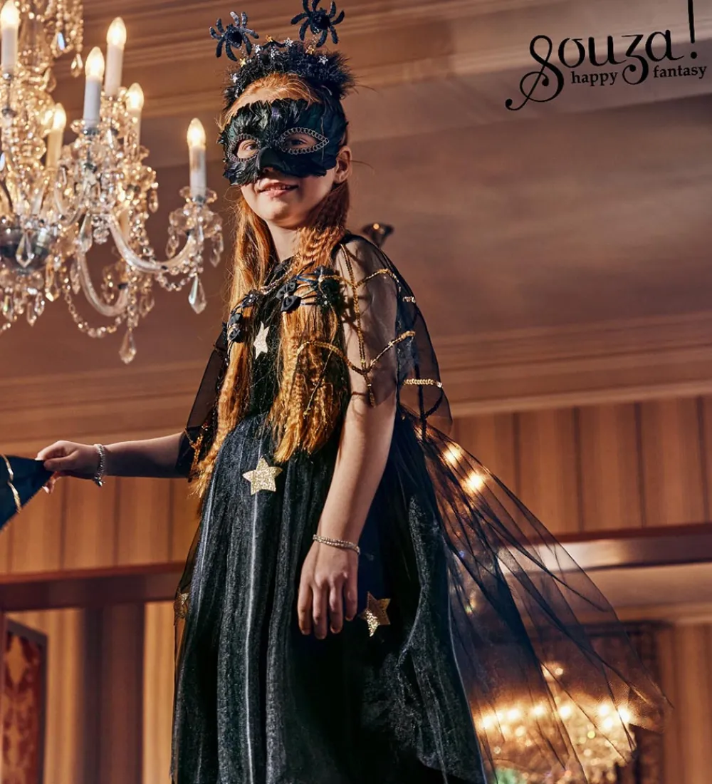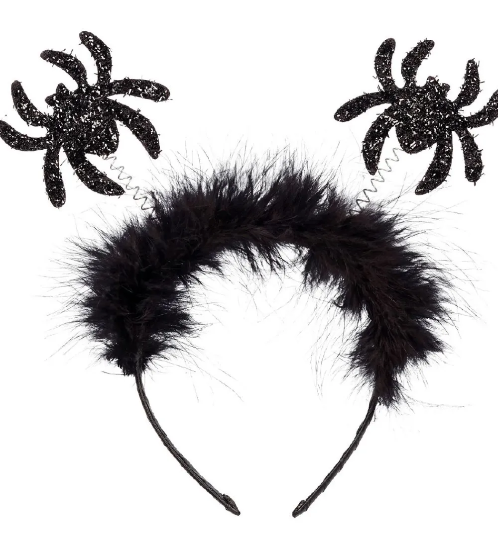 Sødt Souza hårbøjle i sort med, og på toppen er der sorte edderkopper siddende på fjedre.