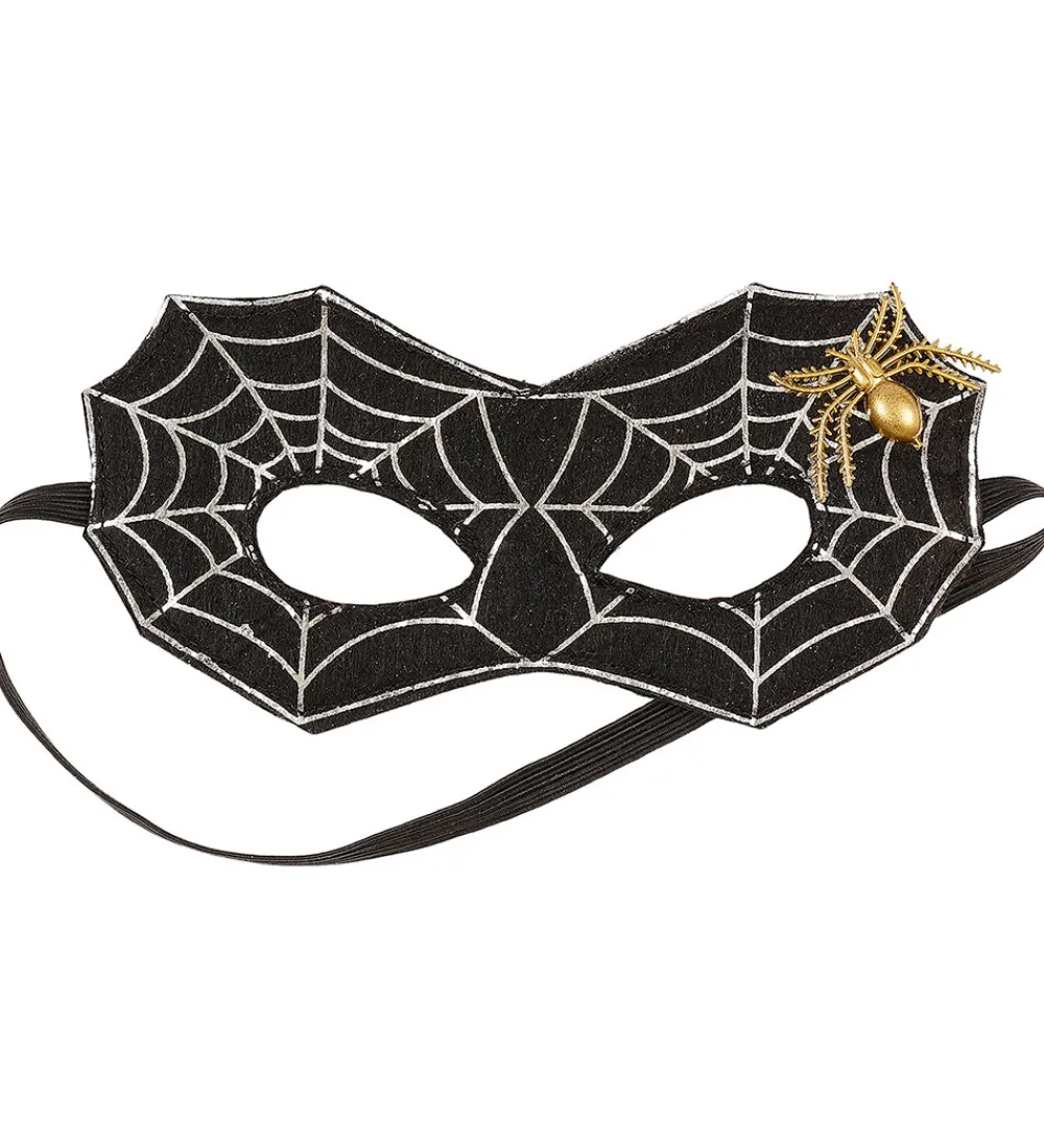Smart Souza Udklædning i form af en maske til et edderkop-kostume, som er sort med spindelvæv i sølvglimmer samt en guldfarvet edderkop.