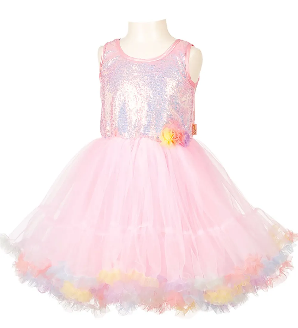 Souza udklædningen er rosa med tyl, pailletter og multifarvede detaljer såsom en blomst ved hoften.