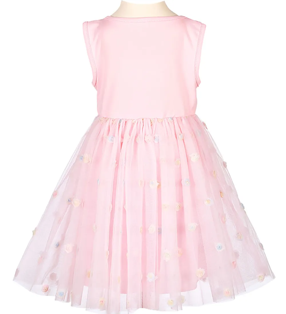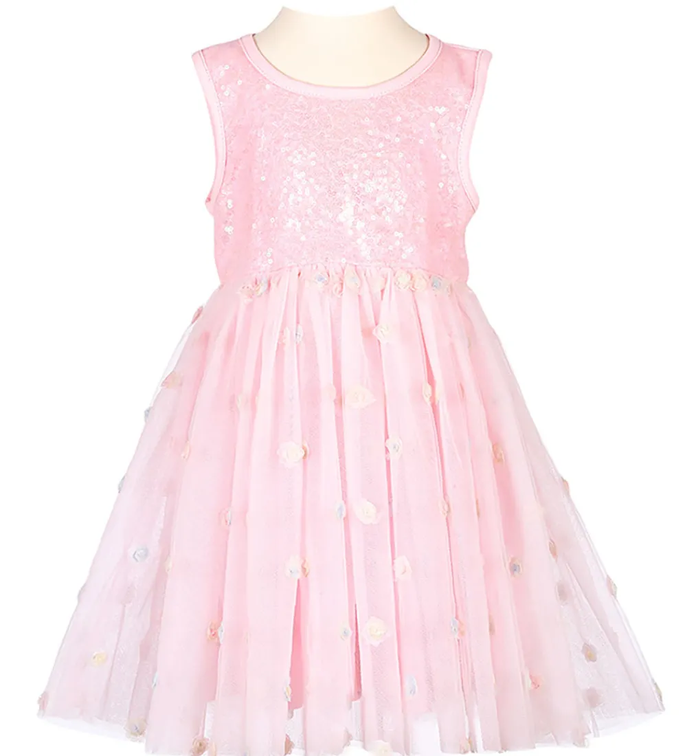 Souza udklædningen er i en flot, rosa farve med pailletter og et tylskørt, som er dekoreret med blomsterapplikationer.