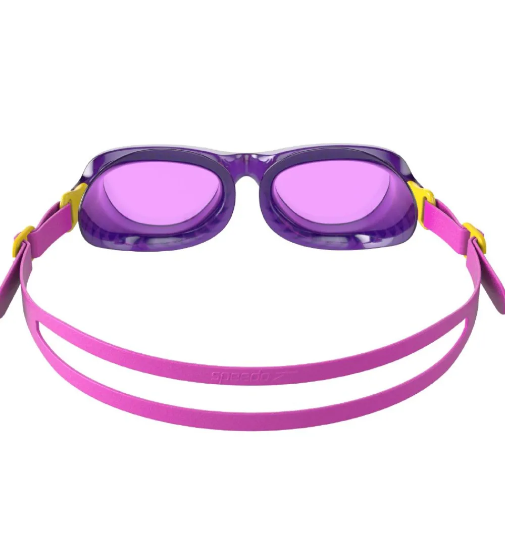 Flotte Speedo svømmebriller til børn i rosa, med lilla lenser og gule detaljer.