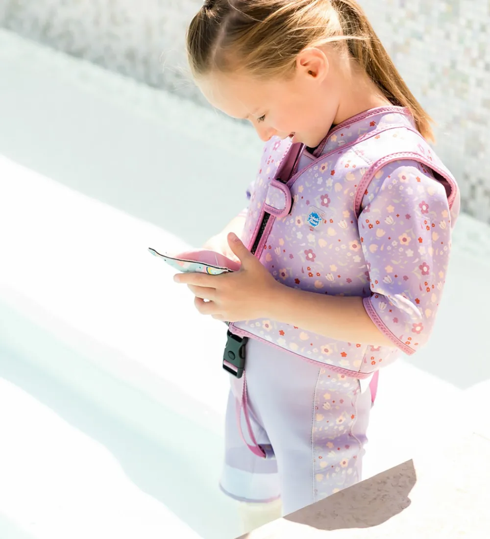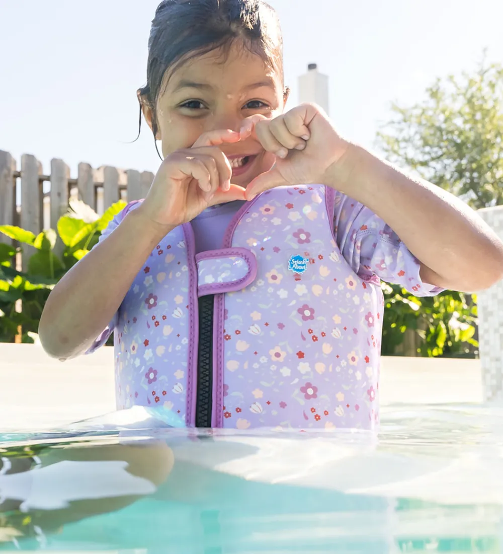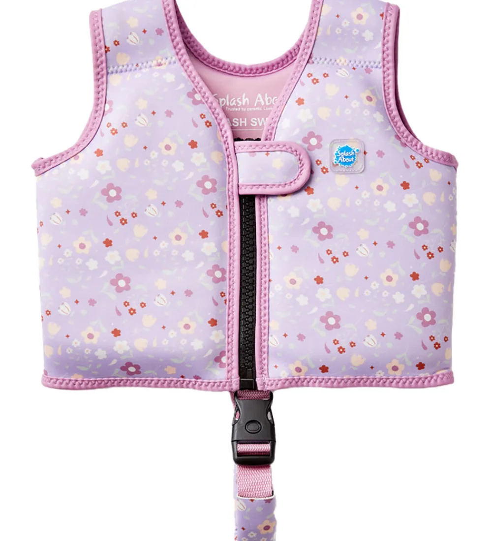 Skøn Splash About svømmevest i lilla med et farverigt alloverprint af blomster og blade. På venstre bryst er der et logo i gummi. Splash About svømmevesten har brede skulderstropper og vesten åbnes fortil med en lynlås og en velcrostrop.
