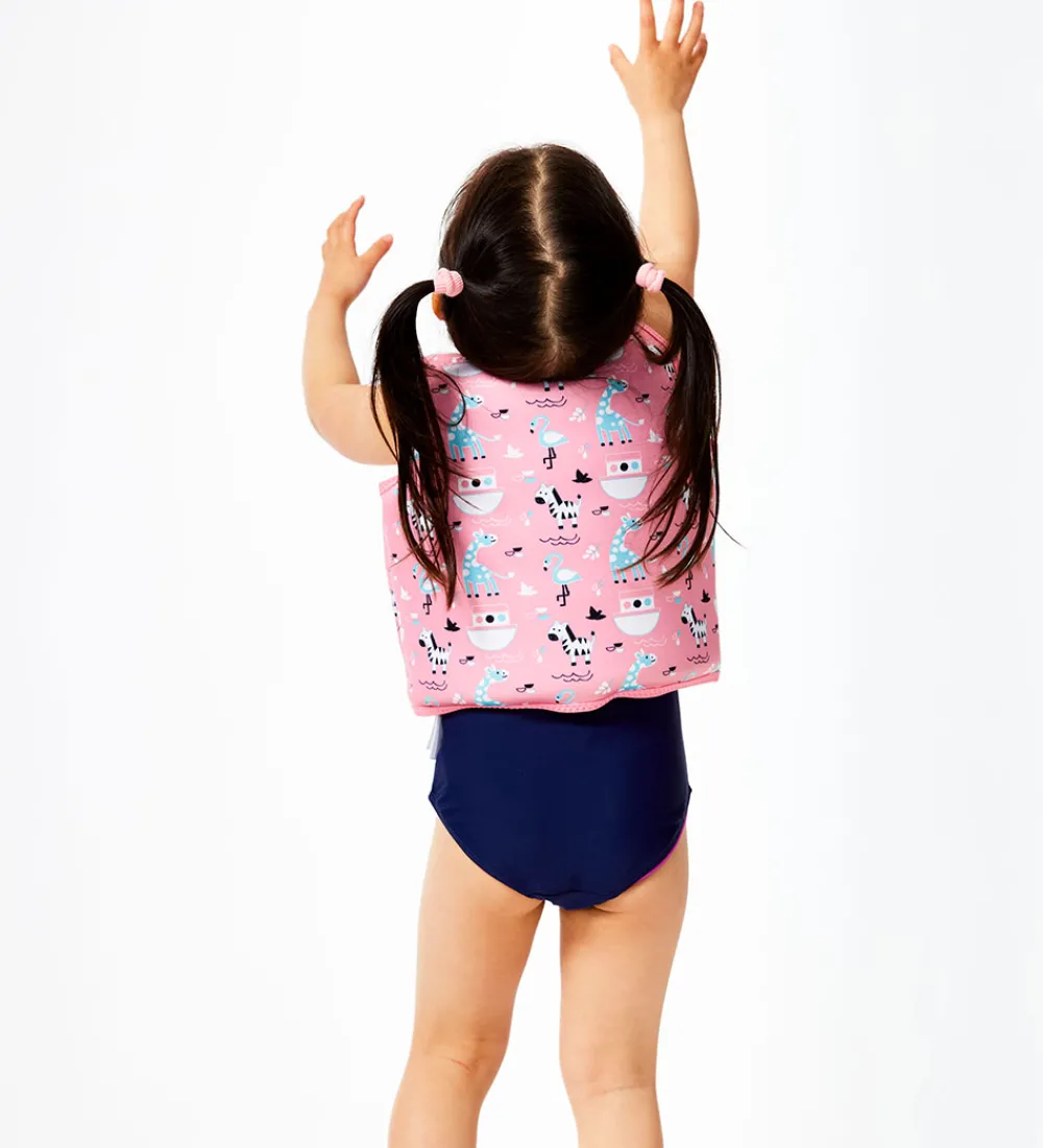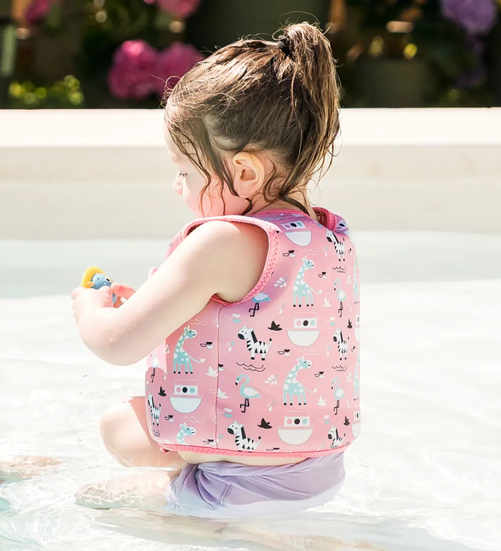 Skøn Splash About svømmevest i rosa med rosa kanter. Svømmevesten er med et print af søde søde dyr og både i flotte farver. På venstre bryst er der et logo i gummi.