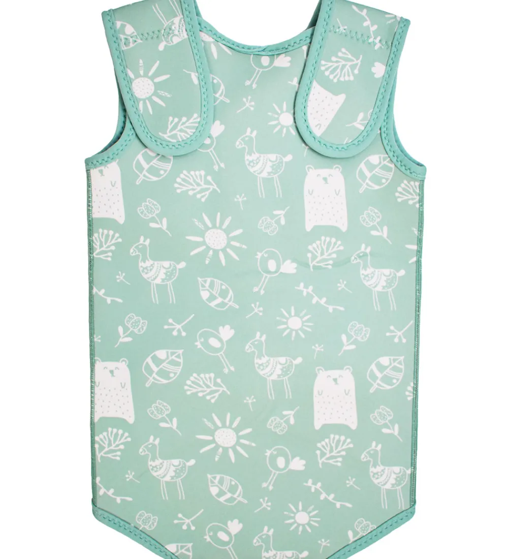 Smart Splash About neoprendragt i støvet grøn, med print af forskellige dyr, planter m.m. i hvid over det hele.