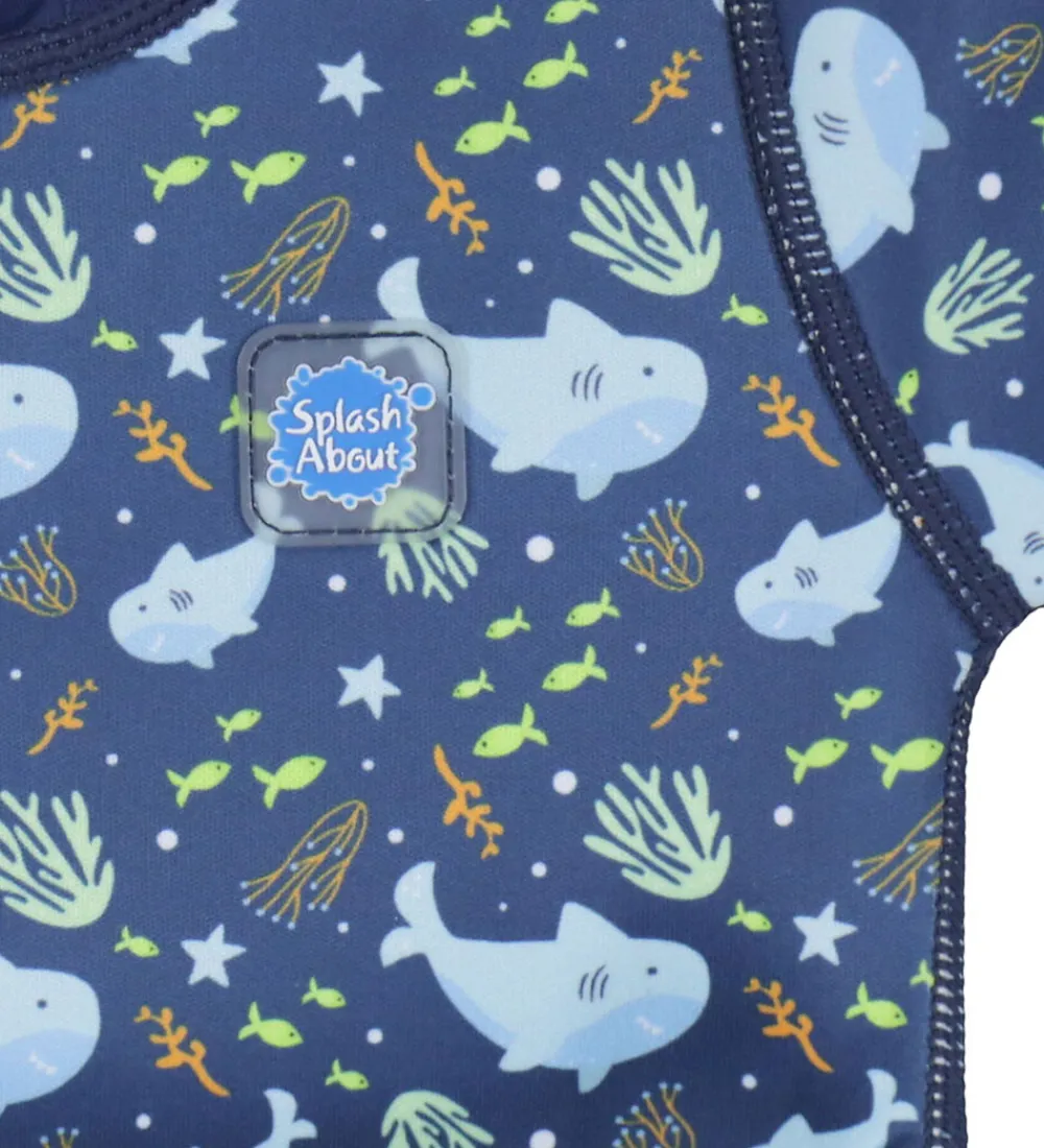 Splash About våddragten har halvlange ærmer, og den åbnes bagpå med en lynlås i nakken. De praktiske Splash About blebadebukser er indsyet i dragten, og de giver en god sikkerhed mod uheld. Blebadebukserne holder tæt og kan bruges uden en almindlig ble. Våddragten har praktiske elastikkanter i alle åbninger, så den bliver siddende som den skal.