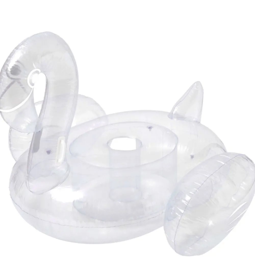 SunnyLife badedyret har en flad ryg med god siddeplads og praktiske håndtag på halsen. Den pustes op med en praktiske ventil, der kan trykkes ind i dyret, så de ikke kommer til at genere legen i vandet.