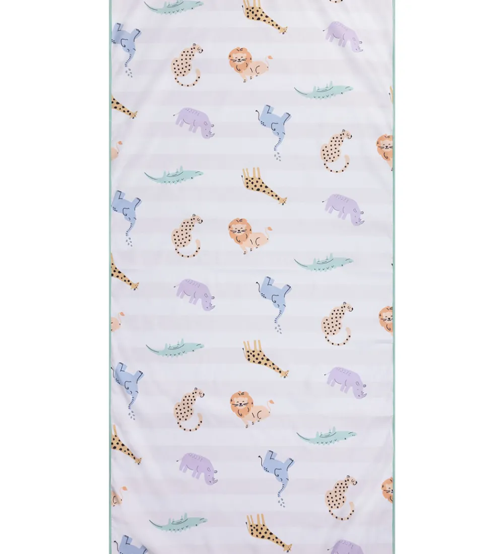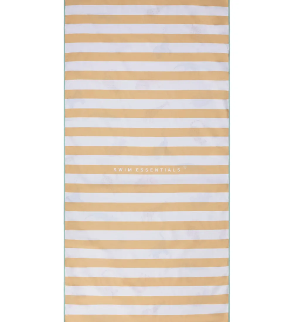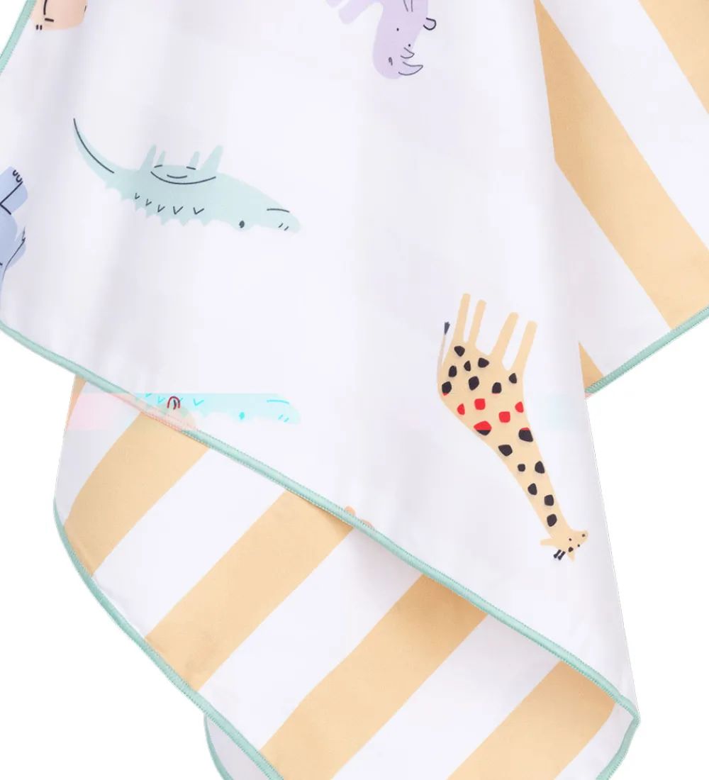 Lækkert Swim Essentials håndklæde i mikrofiber. På den ene side er der et stribet mønster i hvid og gul og på den anden side er det hvidt med print af farverige safaridyr. Håndklædet er letvægtigt, hurtigttørrende og kan foldes sammen, så det er praktisk at have med på farten.