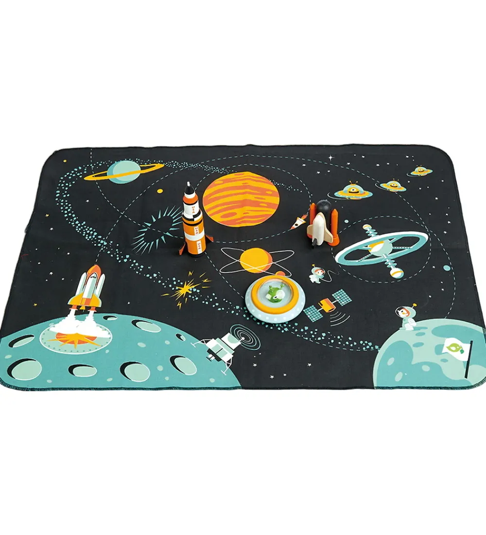 Fantastisk Tender Leaf legetøjssæt bestående af en mørk stofmåtte med et detaljeret rumprint. Tender Leaf legetøjet har raketter og ufoer, der skaber en spændende, rumrejse-inspireret oplevelse for de små opdagelsesrejsende.