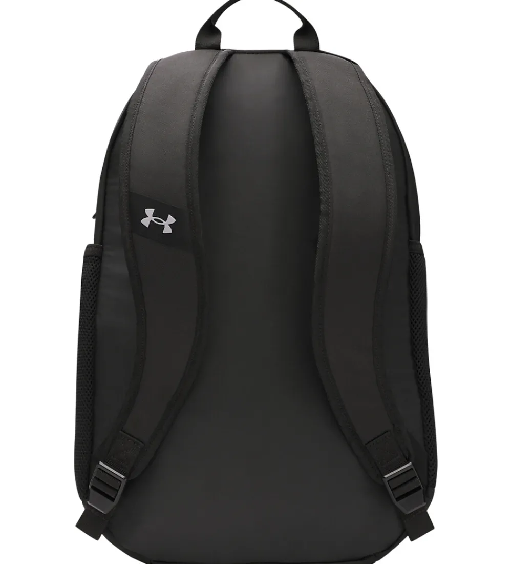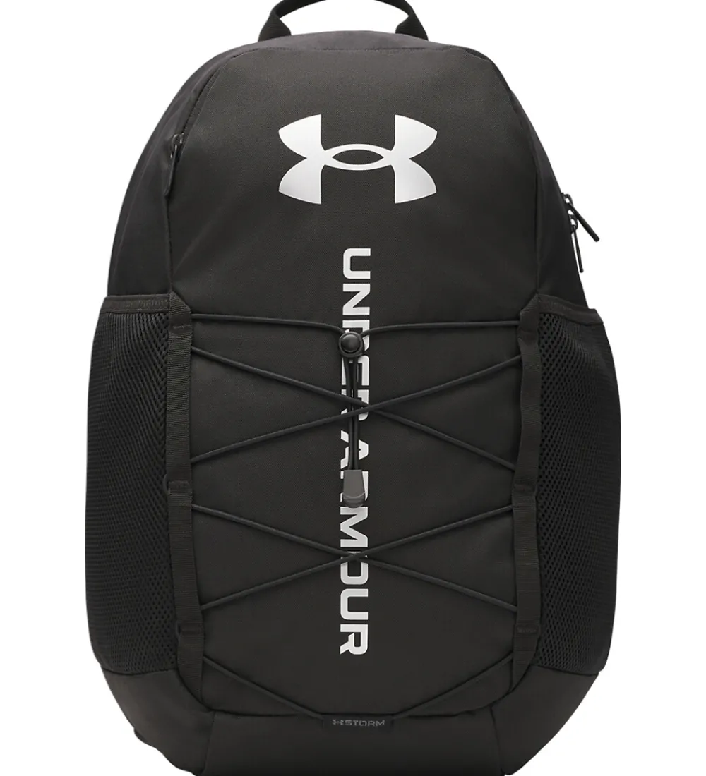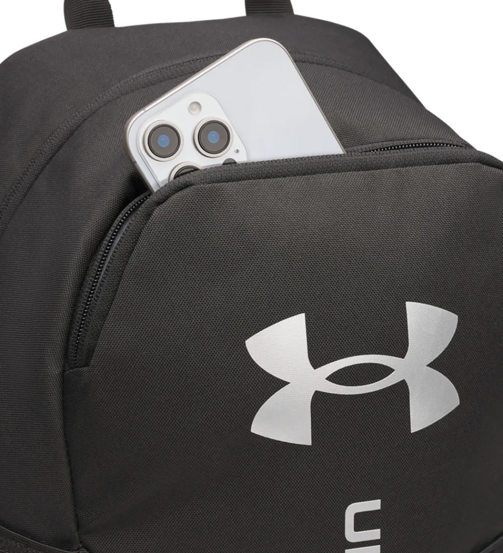 Flot Under Armour rygsæk i sort, og fortil er der et stort, sølvfarvet print.