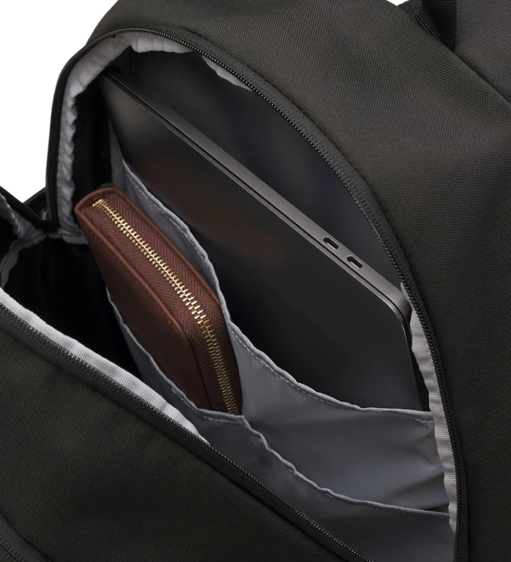 Rygsækken er vatteret i ryggen, og den har justerbare, vatterede skulderstropper.