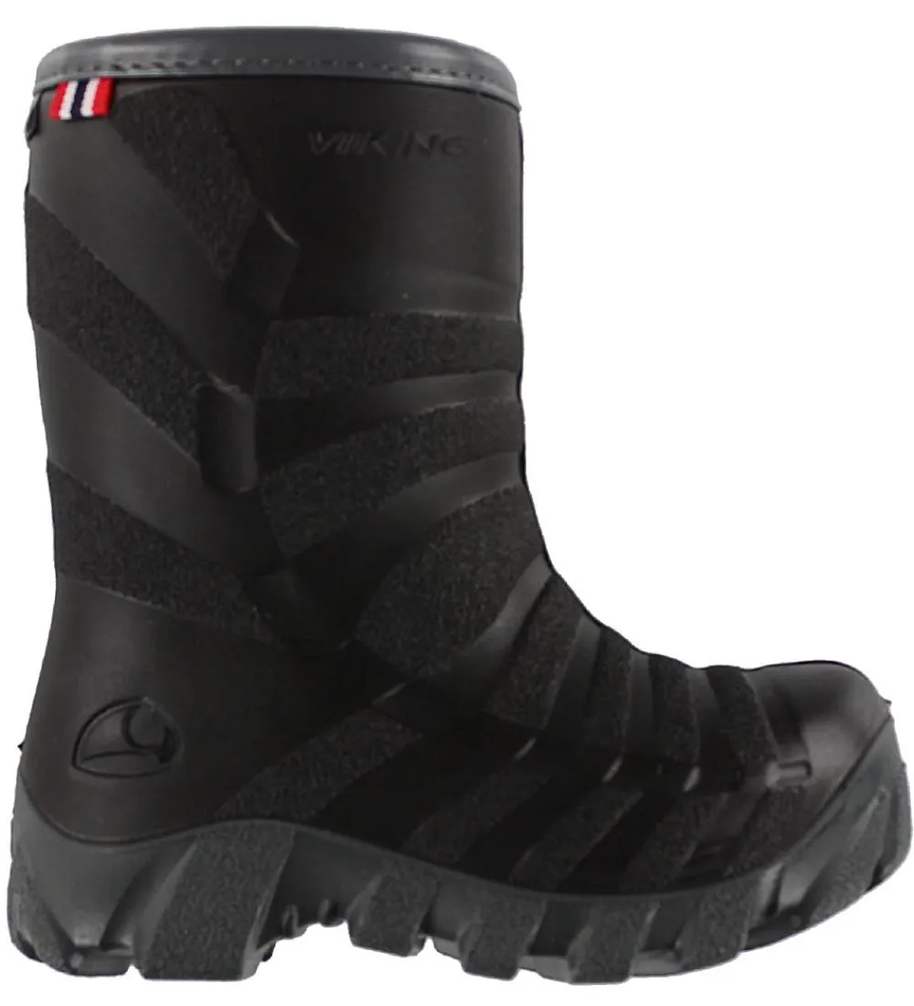 Praktiske Viking termostøvler i sort og grå med en ru og glat struktur skiftevis på støvlen.