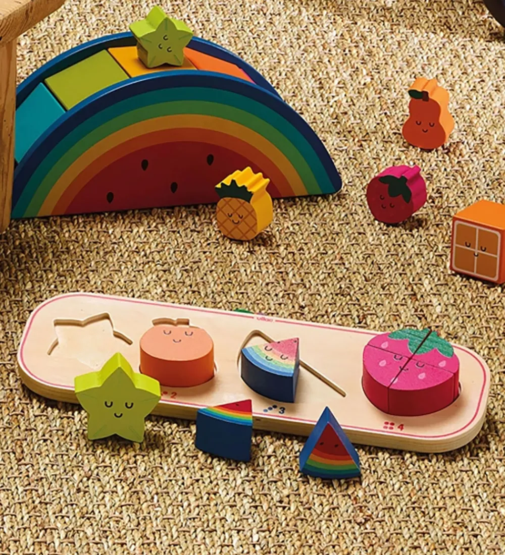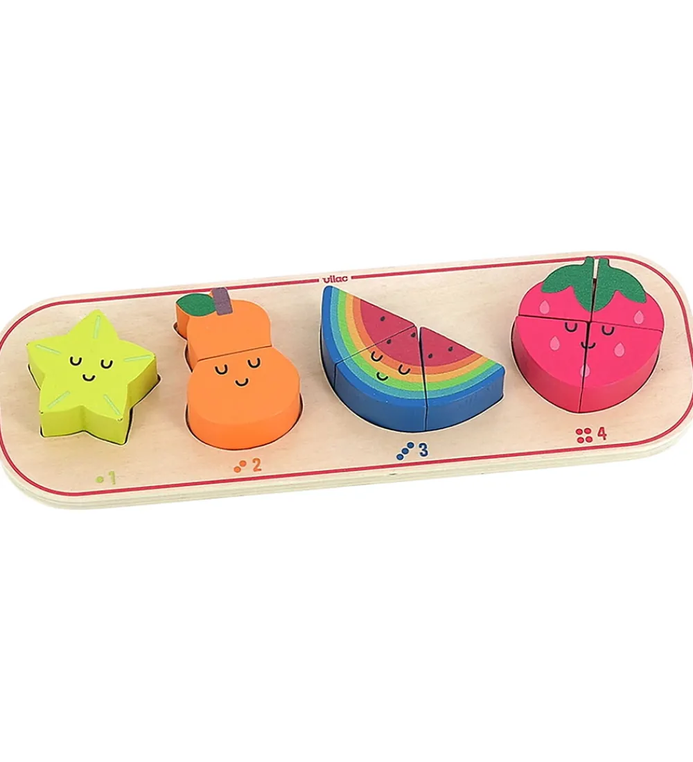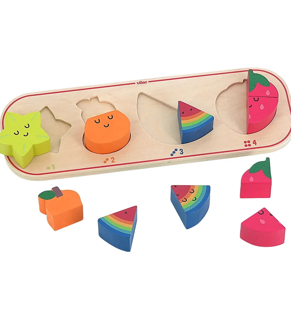 Farverigt Vilac puslespil med sjove frugtfigurer i rød, orange, grøn og blå. Vilac puslespillet ineholder 10 dele og er perfekt til små hænder med fine illustrationer, der gør læring til en leg.
