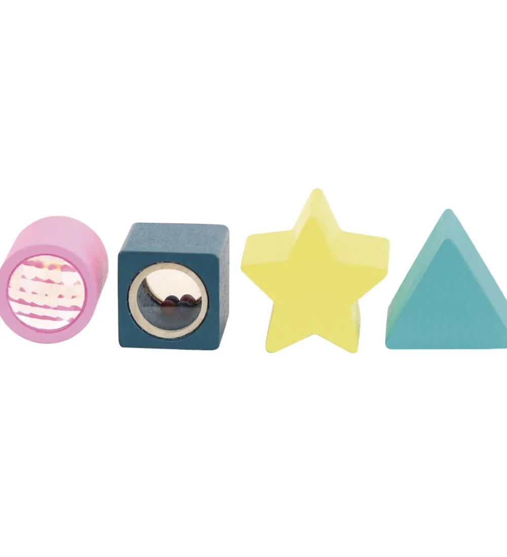 Vilac puttekassen har lyserøde elastiker på den ene side, så det er nemt at få brikkerne ud, selv for de mindste. Til kassen medfølger fire forskellige klodser, som passer i de fire huller rundt omkring på kassen.